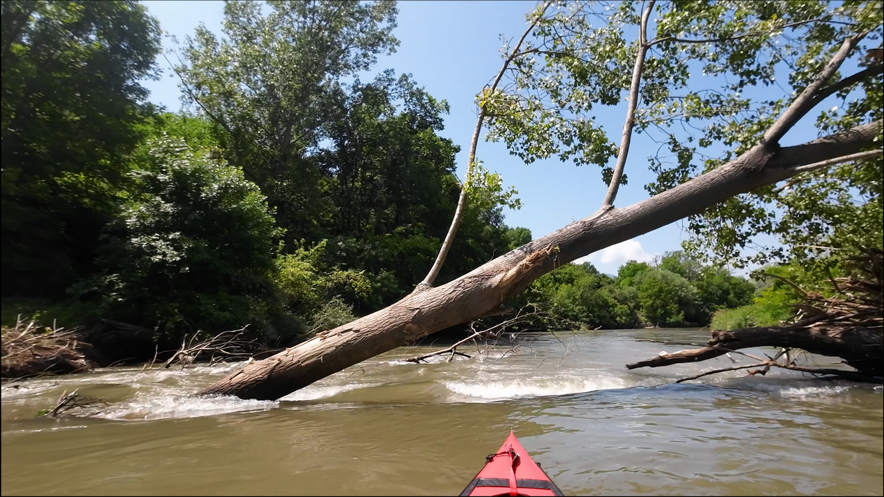 Nach der Weiterfahrt passierten wir die Mündung der Babuna und sahen uns alsbald mit einem Baumhindernis konfrontiert. Ein umgestürzter Baum erstreckte sich vermeintlich über den kompletten Fluss. Bei der hohen Fließgeschwindigkeit nicht ungefährlich. Vorsichtig näherten wir uns in Ufernähe dem Hindernis, auf der rechten Seite hatten wir ein wenig Platz den Baum zu passieren und den kurz darauf folgenden Bäumen am Uferrand wieder nach links auszuweichen.