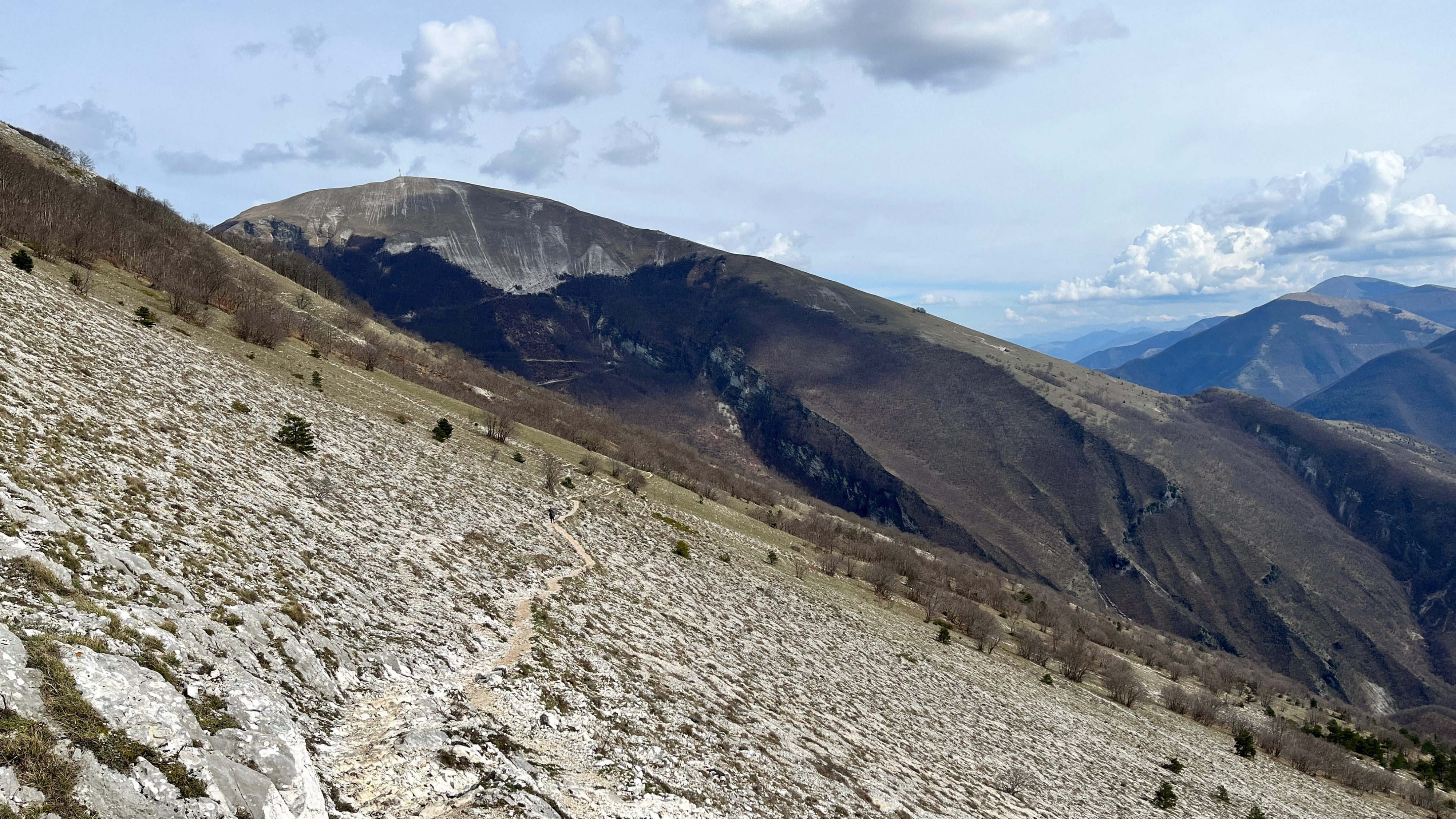 Gegen Mittag treffe Ich wieder auf den Sentiero Italia. Als Ich mich Richtung Monte Catria orientiere kann Ich zum ersten mal in der Ferne die schneebeckten Gipfel der Sibilini Berge, das Ziel meiner Wanderung, erkennen. Ca. 65 Km Luftlinie entfernt.