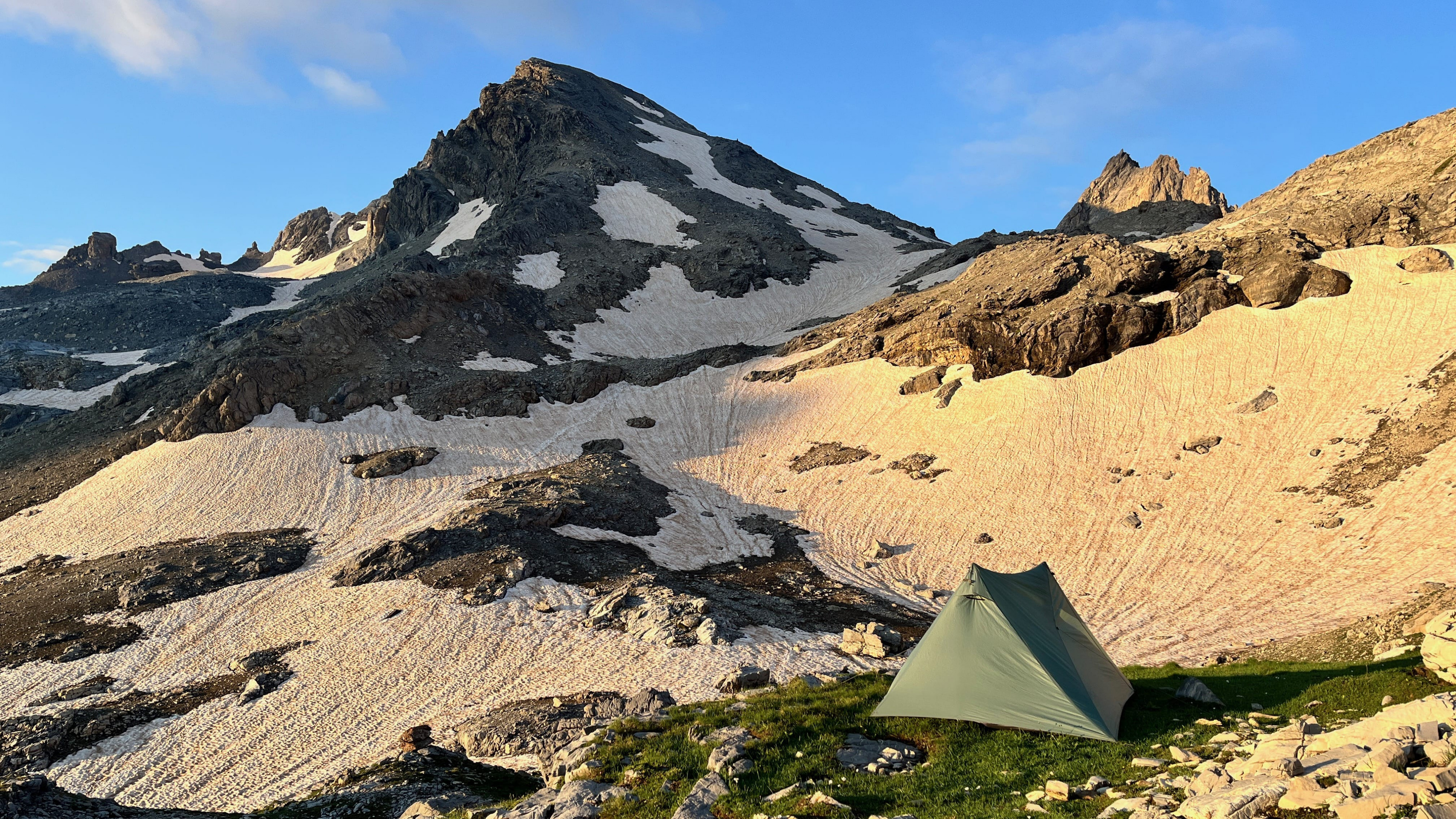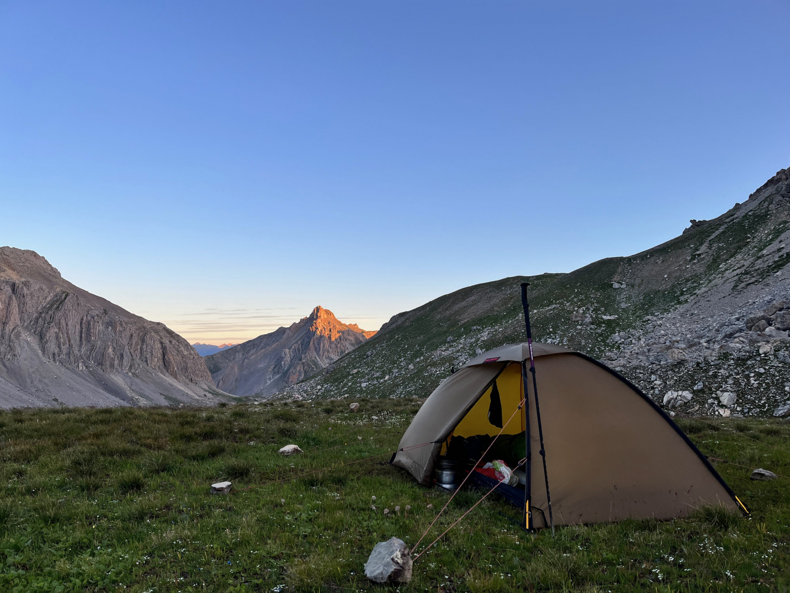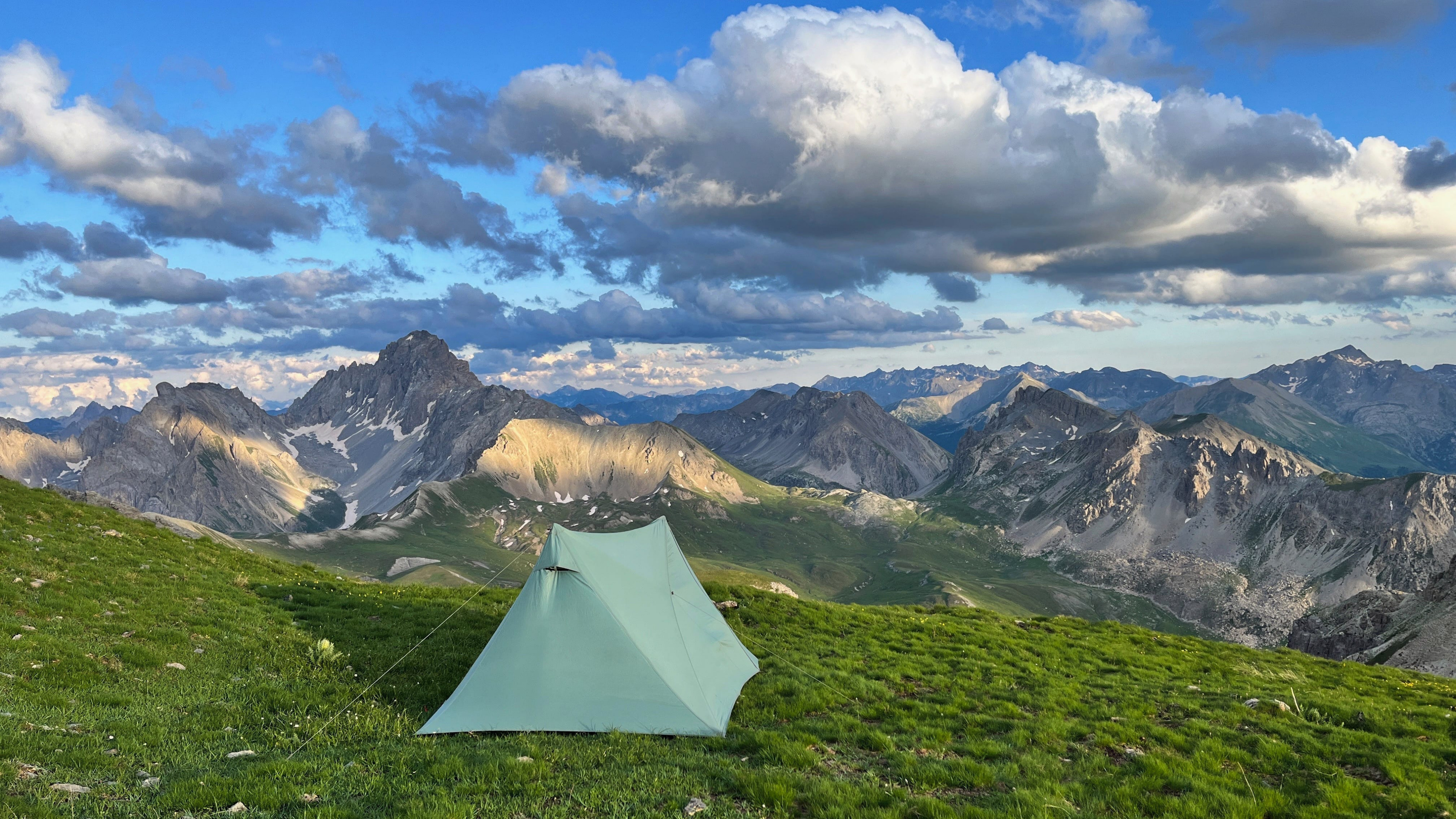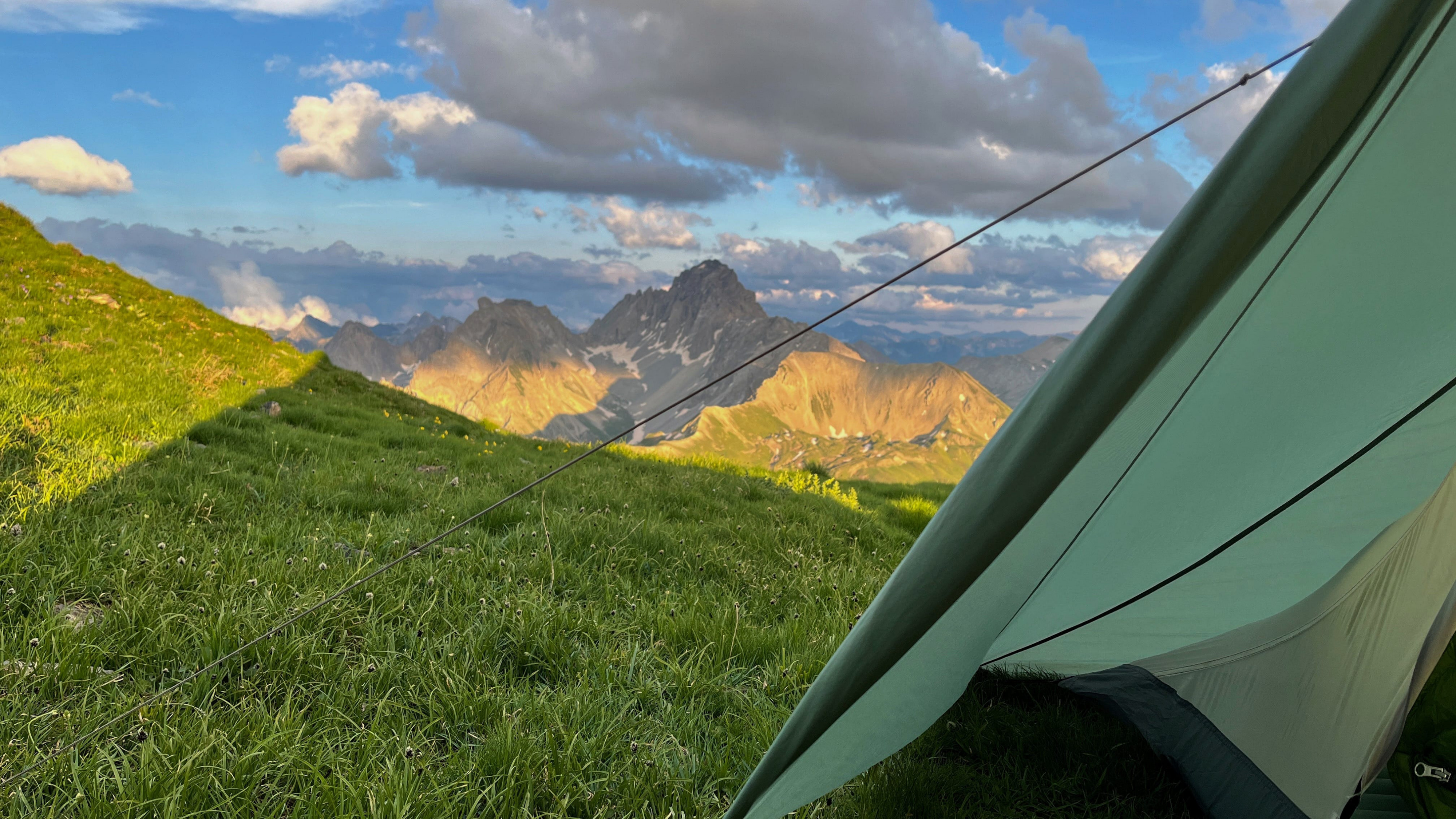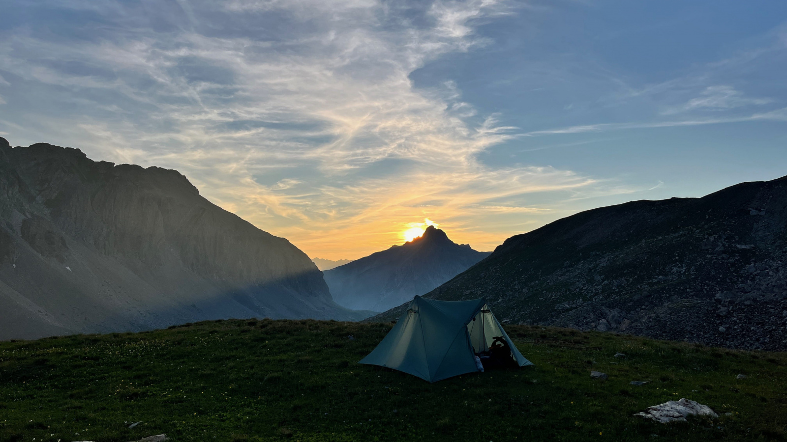 Überraschenderweise finde Ich alsbald hinter dem Monte Viraysse eine grasbewachsene, (fast) ebene Fläche im Windschatten. Da muss Ich gar nicht lange überlegen, kurz darauf steht das Zelt und Ich staune über die großartige Hochgebirgslandschaft, das Lichtspiel zwischen Sonne und Wolken und das langsame anbrechen der Dämmerung.​