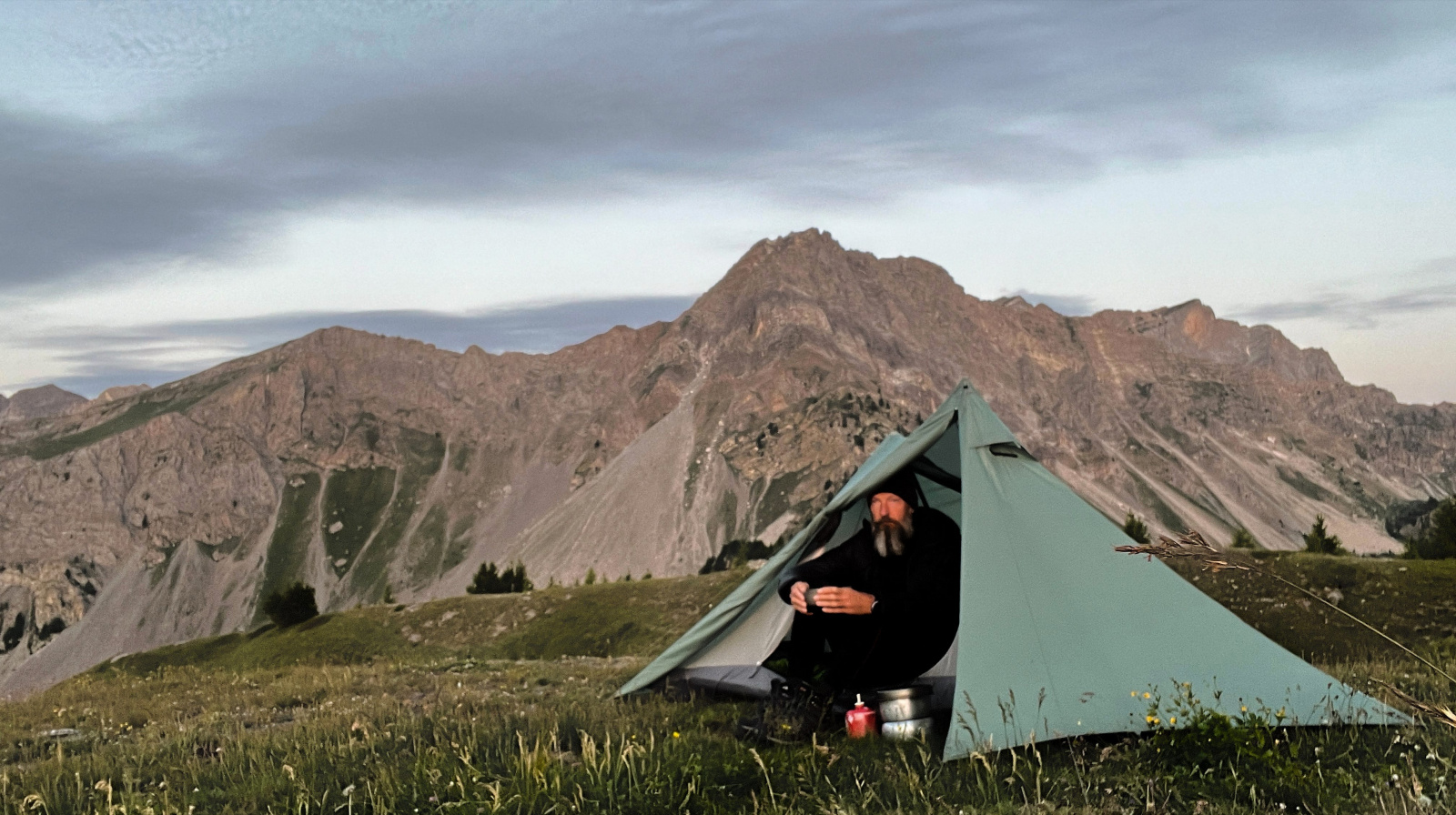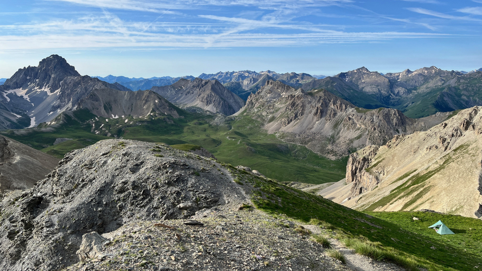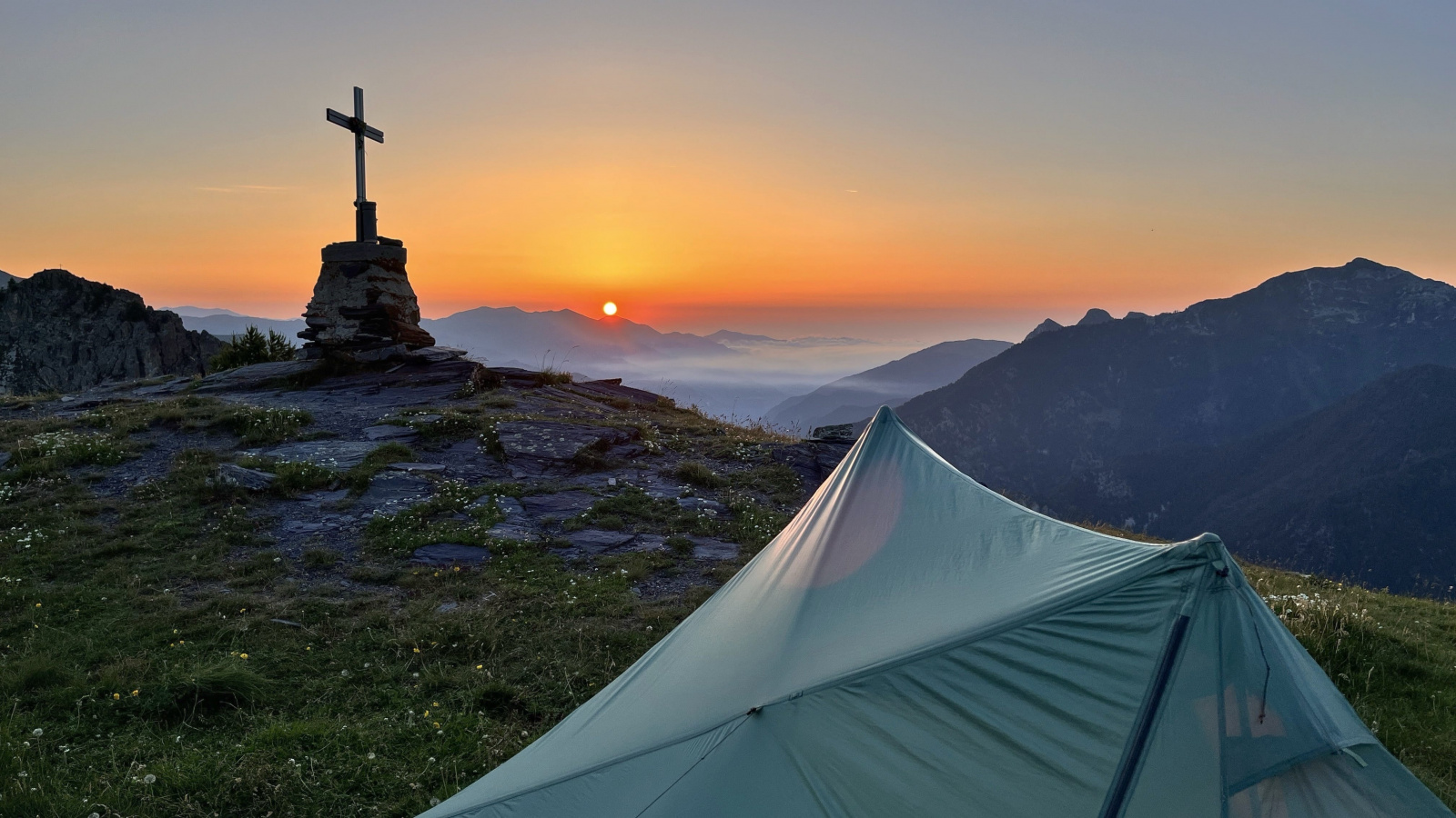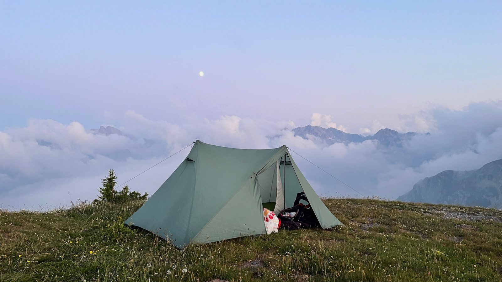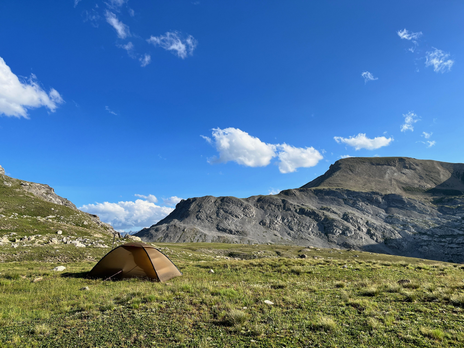 Überraschenderweise finde Ich alsbald hinter dem Monte Viraysse eine grasbewachsene, (fast) ebene Fläche im Windschatten. Da muss Ich gar nicht lange überlegen, kurz darauf steht das Zelt und Ich staune über die großartige Hochgebirgslandschaft, das Lichtspiel zwischen Sonne und Wolken und das langsame anbrechen der Dämmerung.​