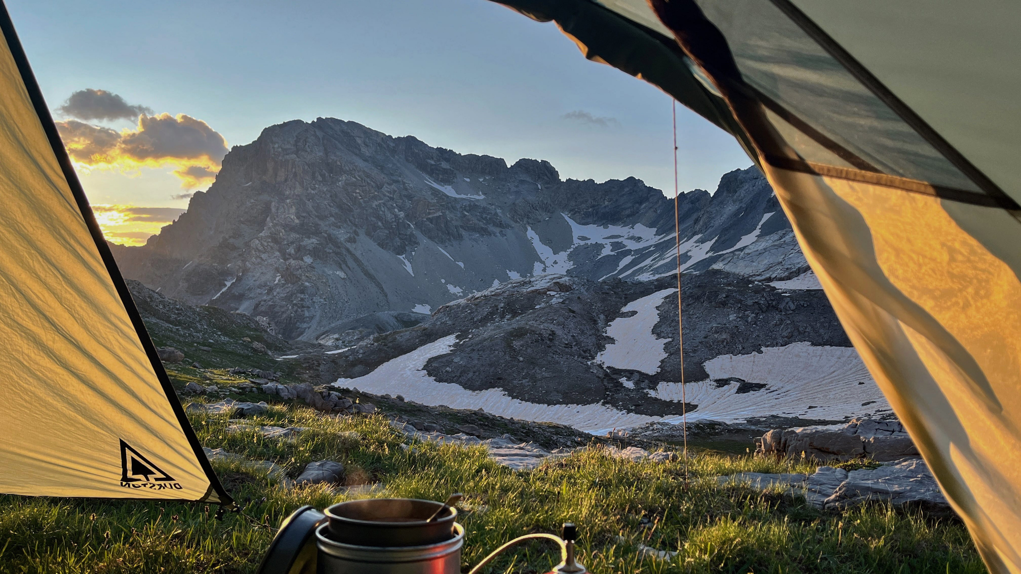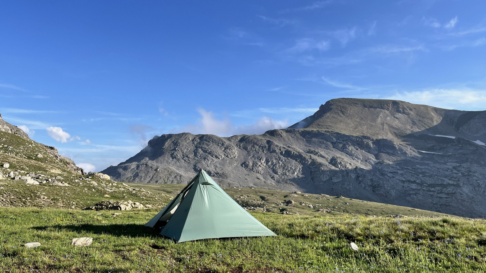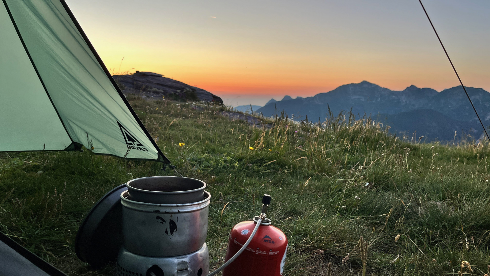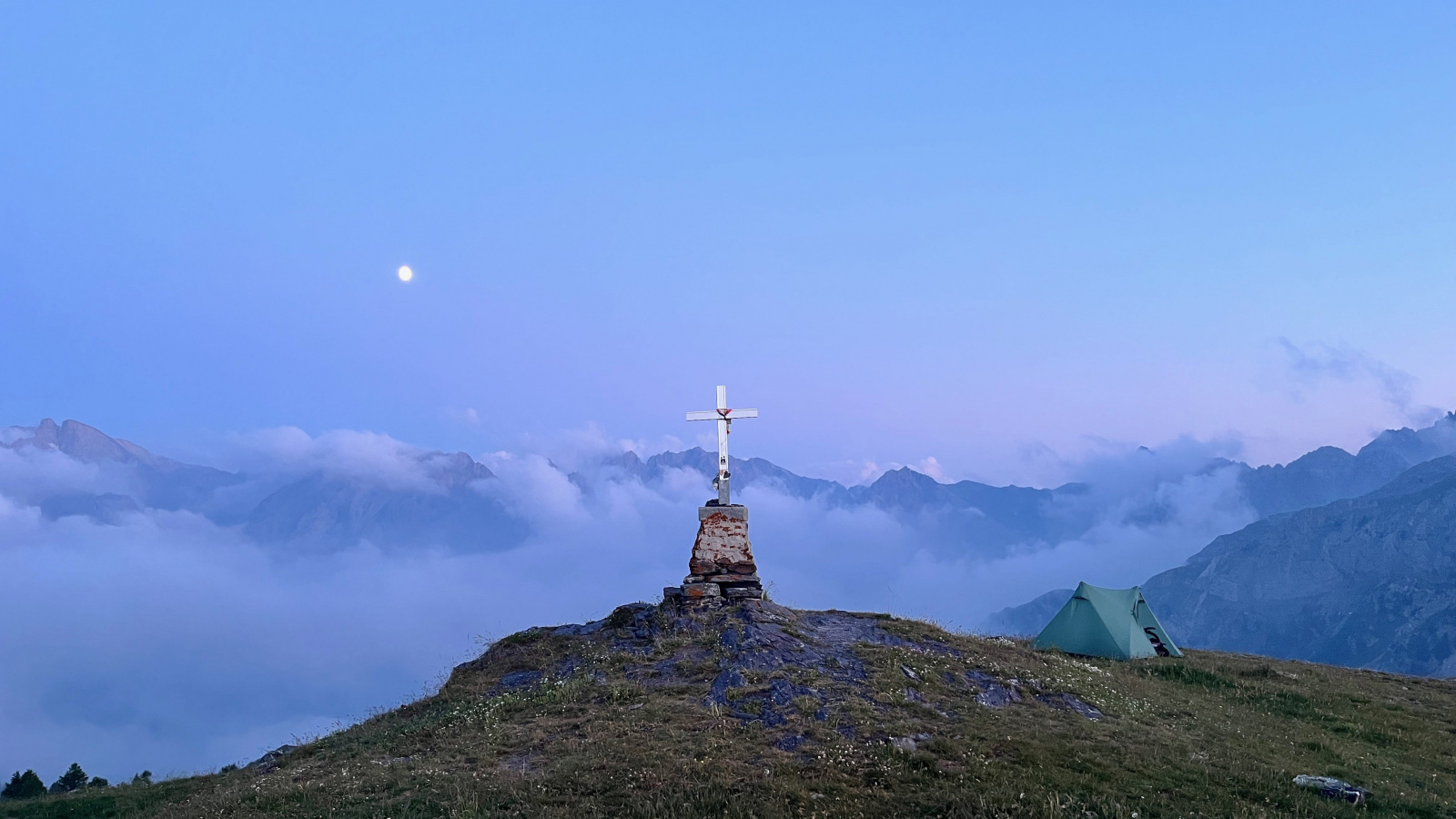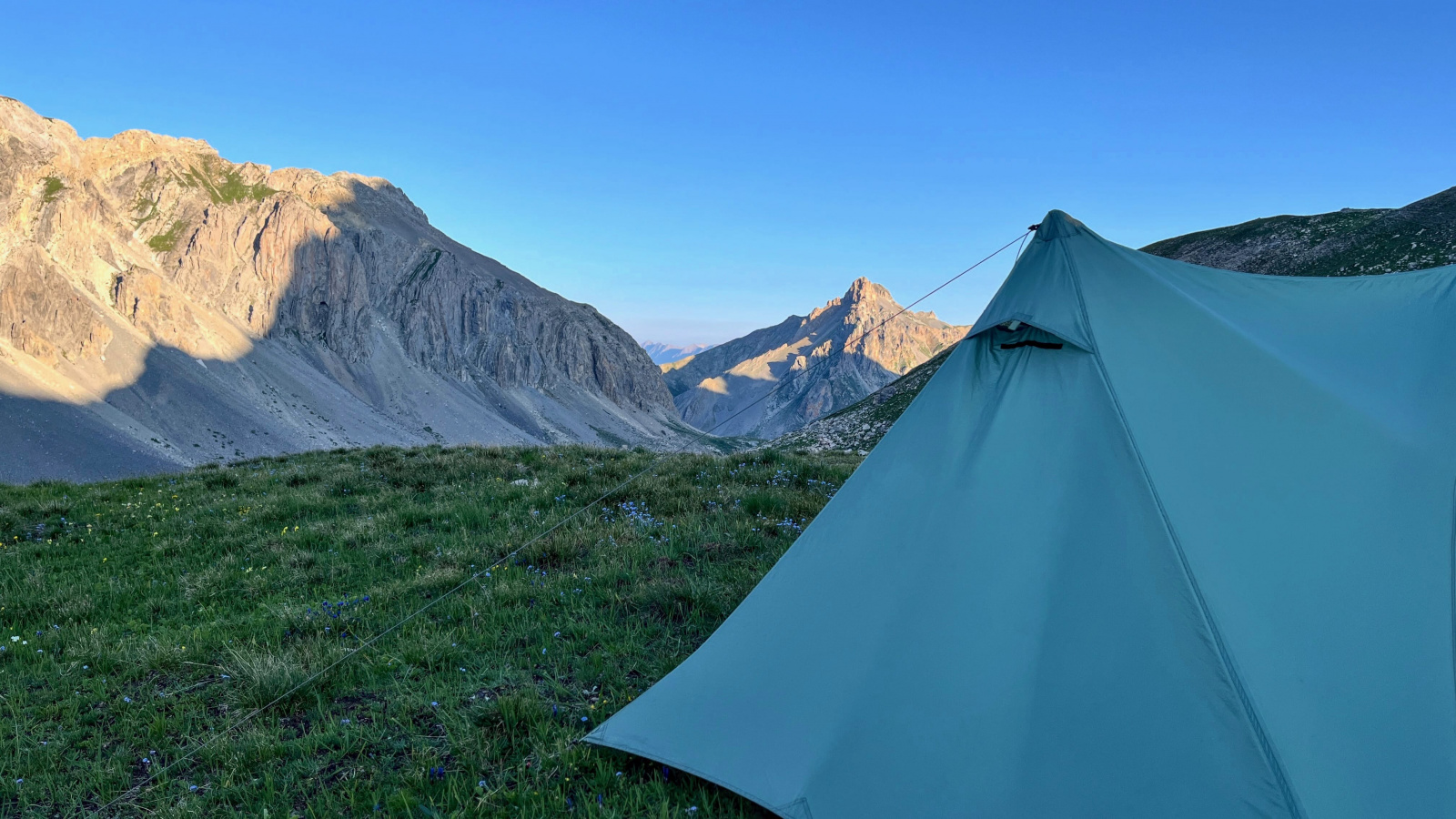 Überraschenderweise finde Ich alsbald hinter dem Monte Viraysse eine grasbewachsene, (fast) ebene Fläche im Windschatten. Da muss Ich gar nicht lange überlegen, kurz darauf steht das Zelt und Ich staune über die großartige Hochgebirgslandschaft, das Lichtspiel zwischen Sonne und Wolken und das langsame anbrechen der Dämmerung.​