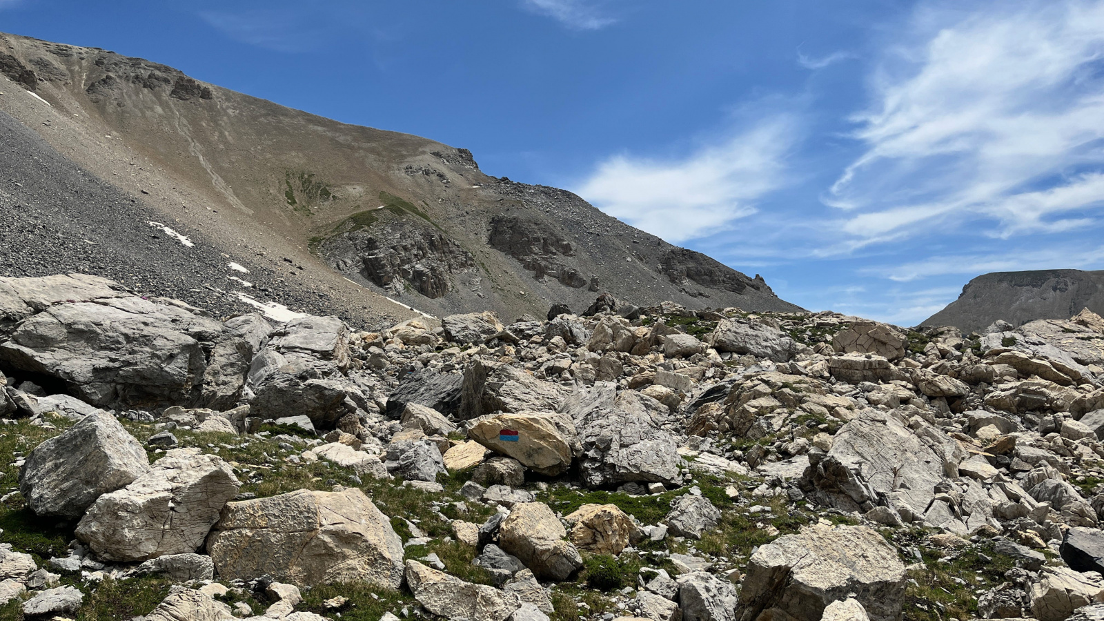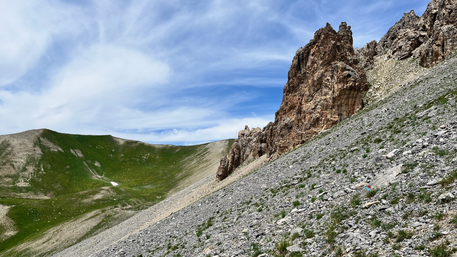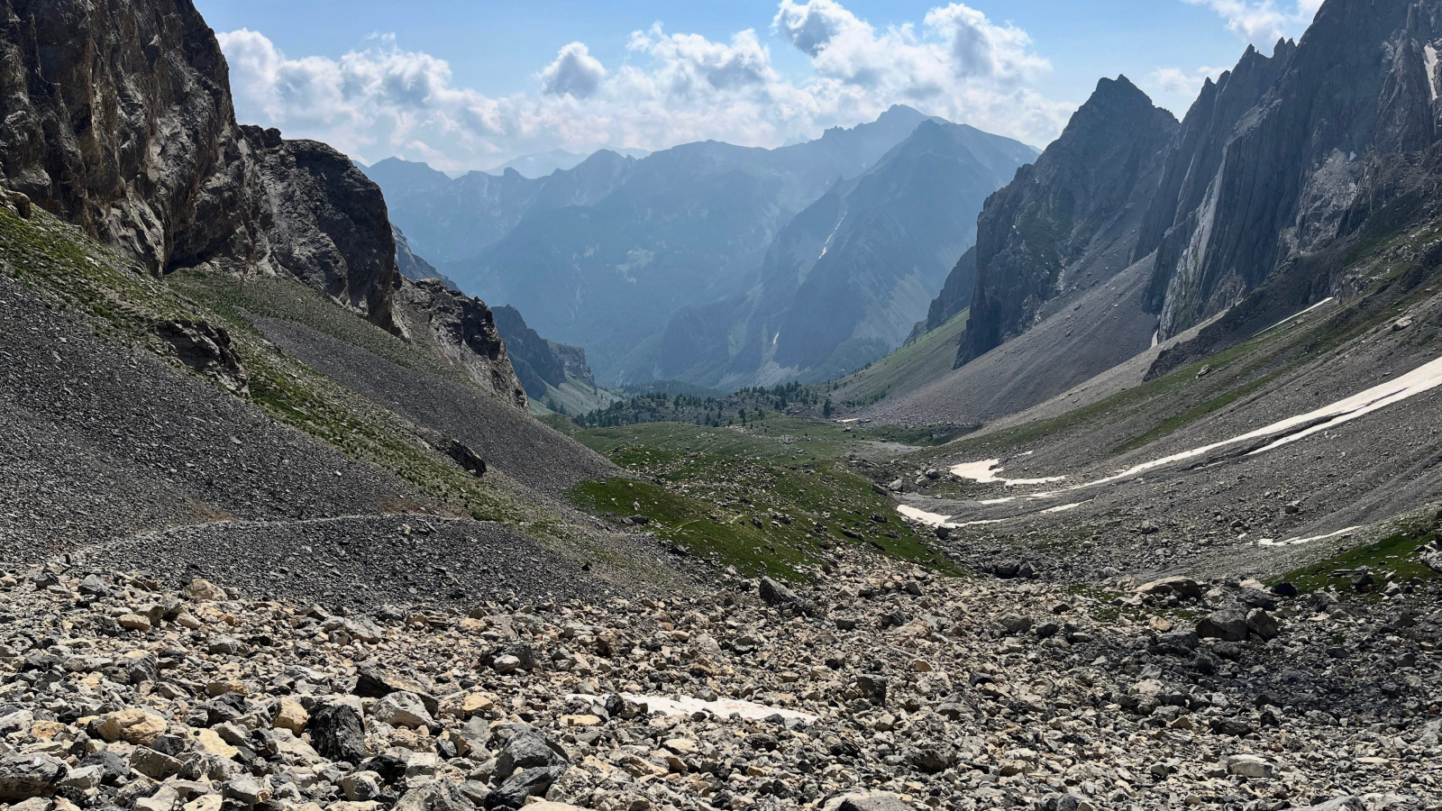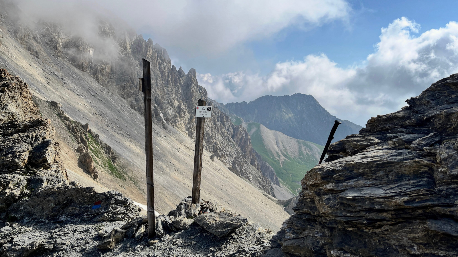 So langsam neigt sich diese Tour dem Ende zu, aber vorher geht es nochmal etwas hinauf, und zwar wieder recht steil auf losem Schutt. Mit viel Gewicht, bei mir mehr Rucksackgewicht als Körpergewicht, nicht unbedingt zu empfehlen. Aber nach einiger "Arbeit" stehe Ich oben auf dem Pass, dem Colle Feuillas (2749m), der Grenze zu Italien. Ich habe von hier eine gute Sicht nach Osten ins Tal, im Nordhang liegt auch hier noch einiges an Schnee.