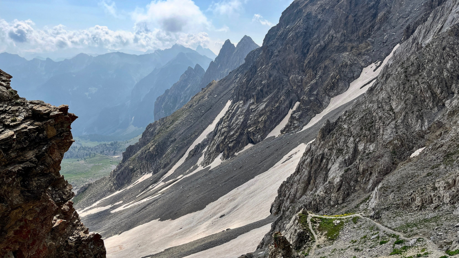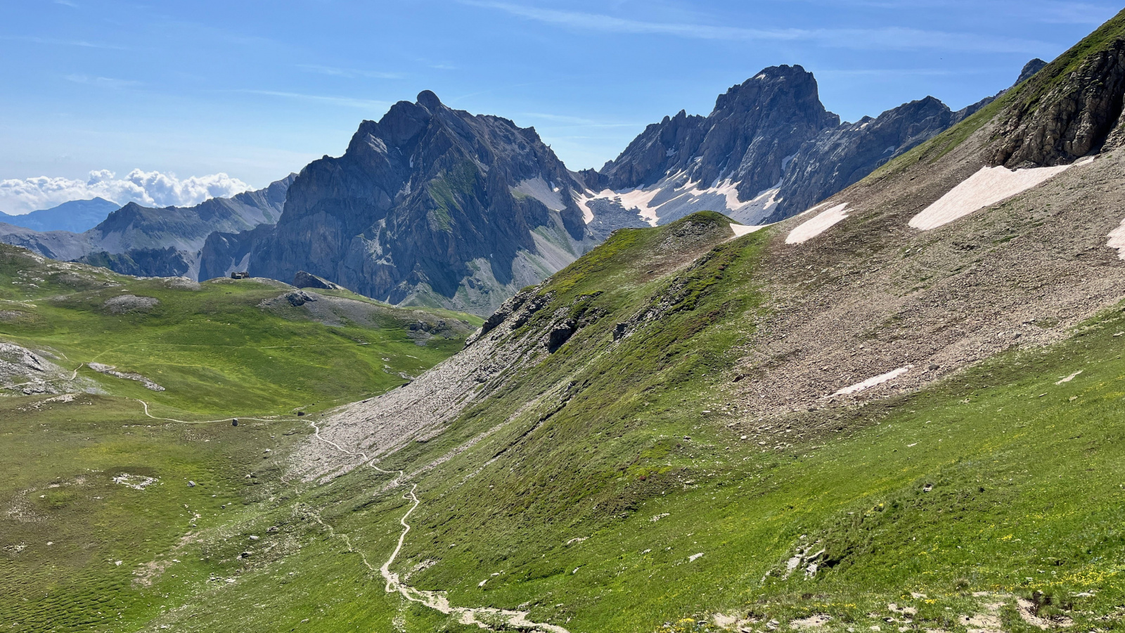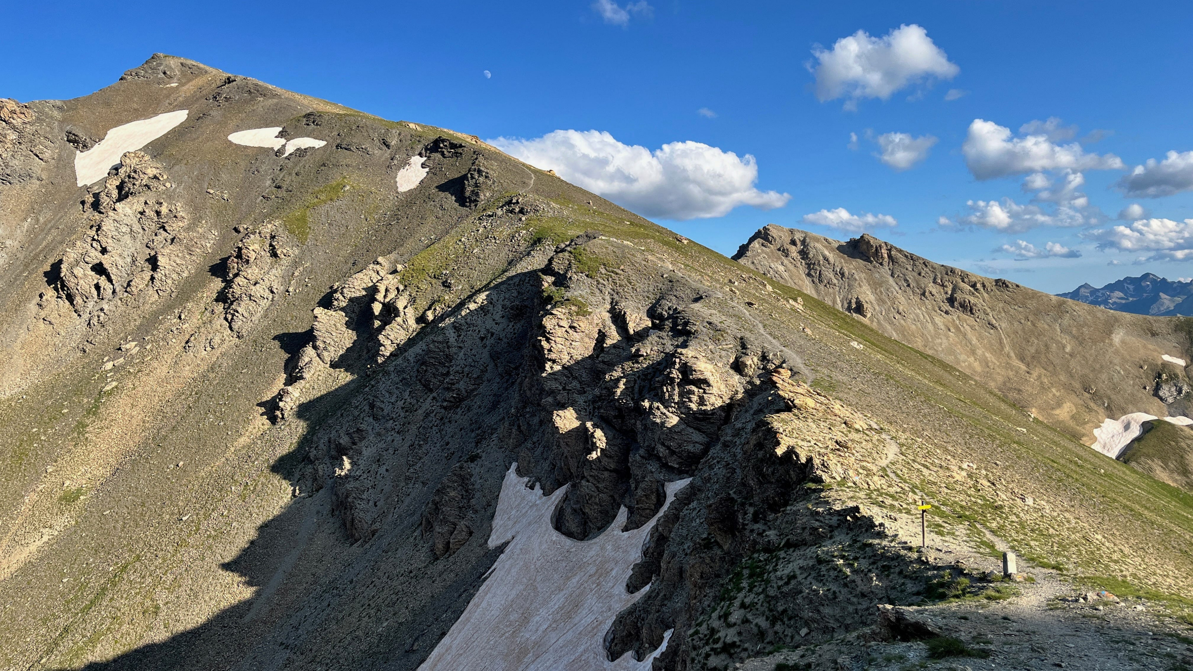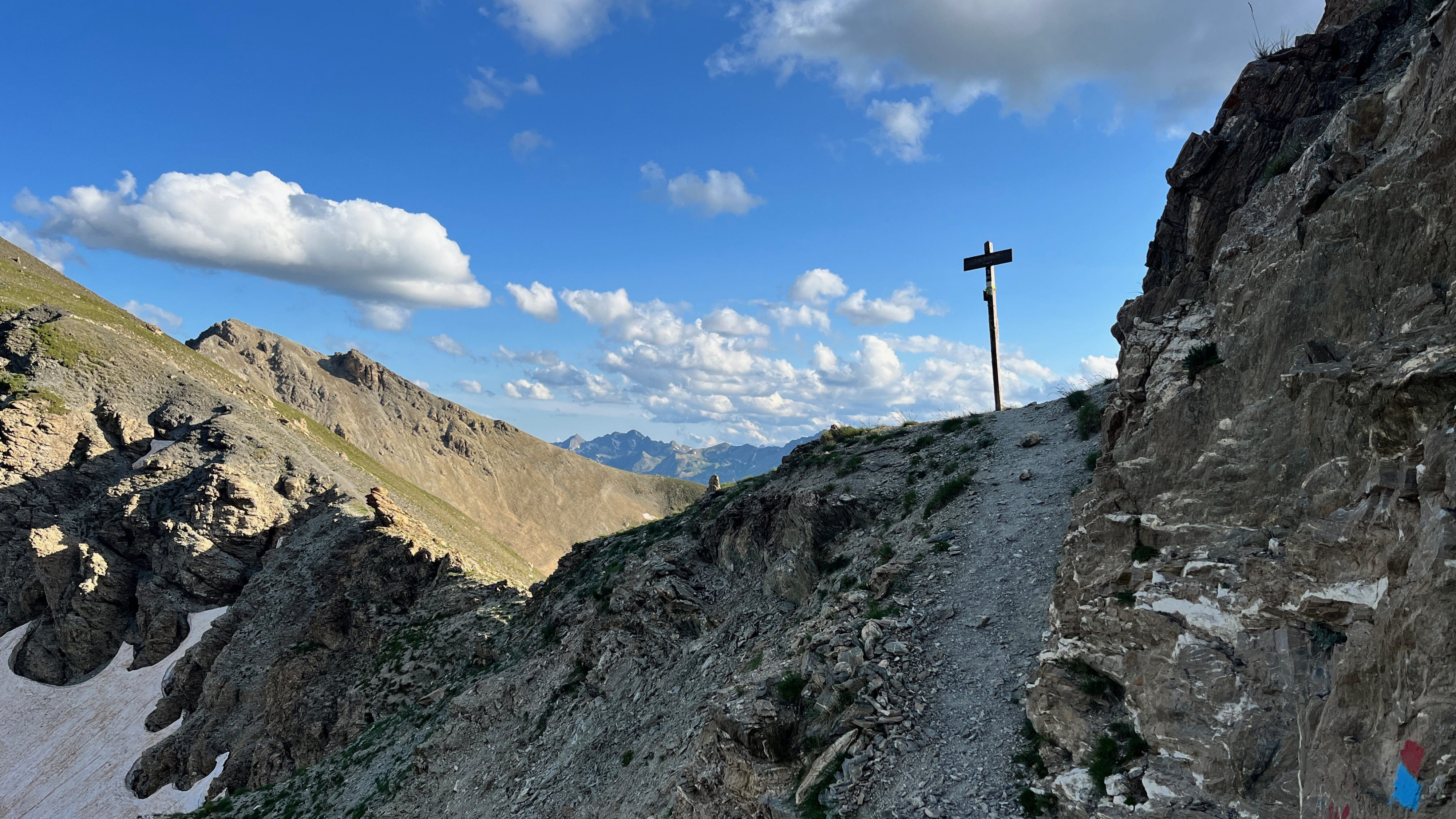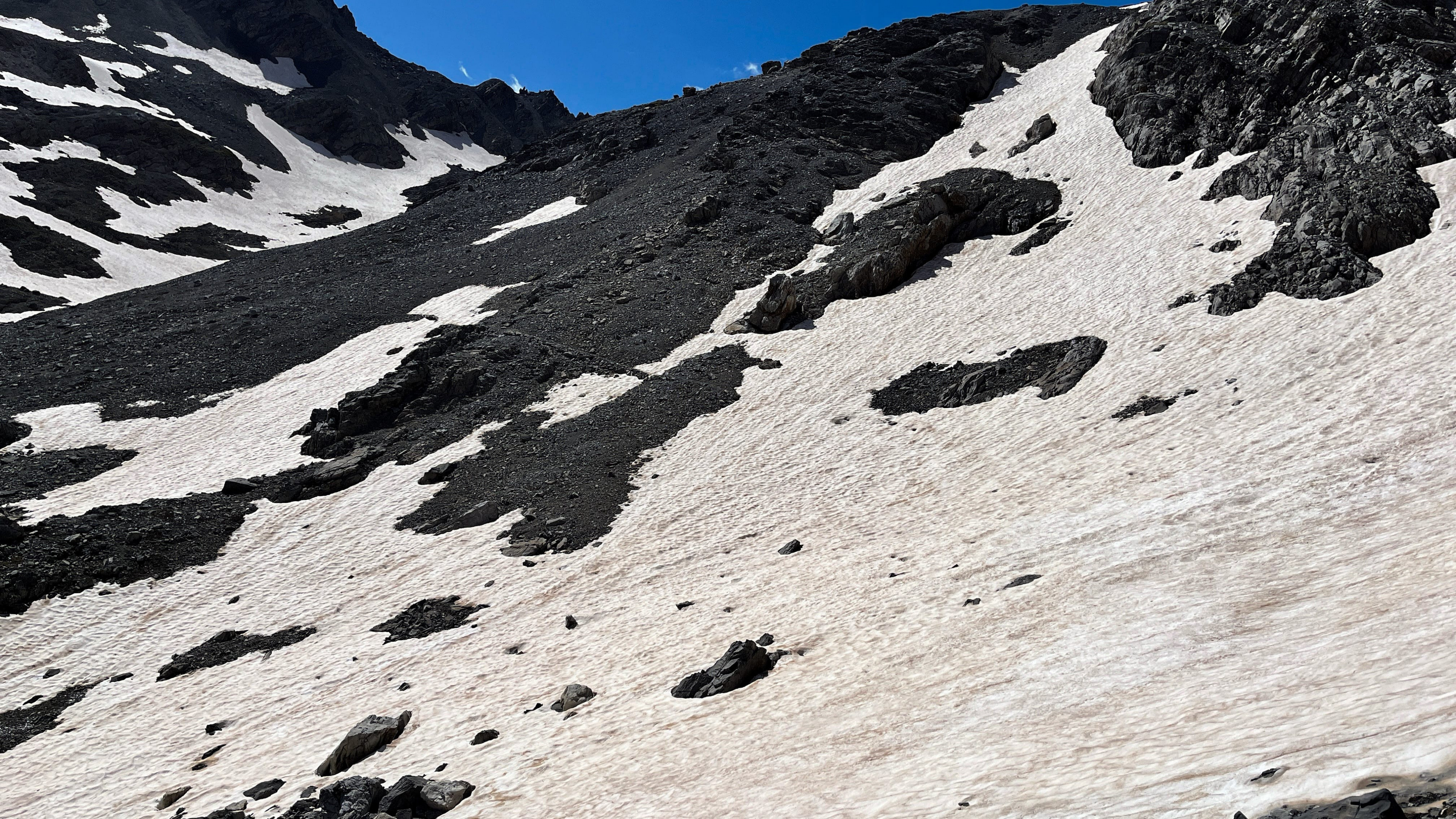 So langsam neigt sich diese Tour dem Ende zu, aber vorher geht es nochmal etwas hinauf, und zwar wieder recht steil auf losem Schutt. Mit viel Gewicht, bei mir mehr Rucksackgewicht als Körpergewicht, nicht unbedingt zu empfehlen. Aber nach einiger "Arbeit" stehe Ich oben auf dem Pass, dem Colle Feuillas (2749m), der Grenze zu Italien. Ich habe von hier eine gute Sicht nach Osten ins Tal, im Nordhang liegt auch hier noch einiges an Schnee.