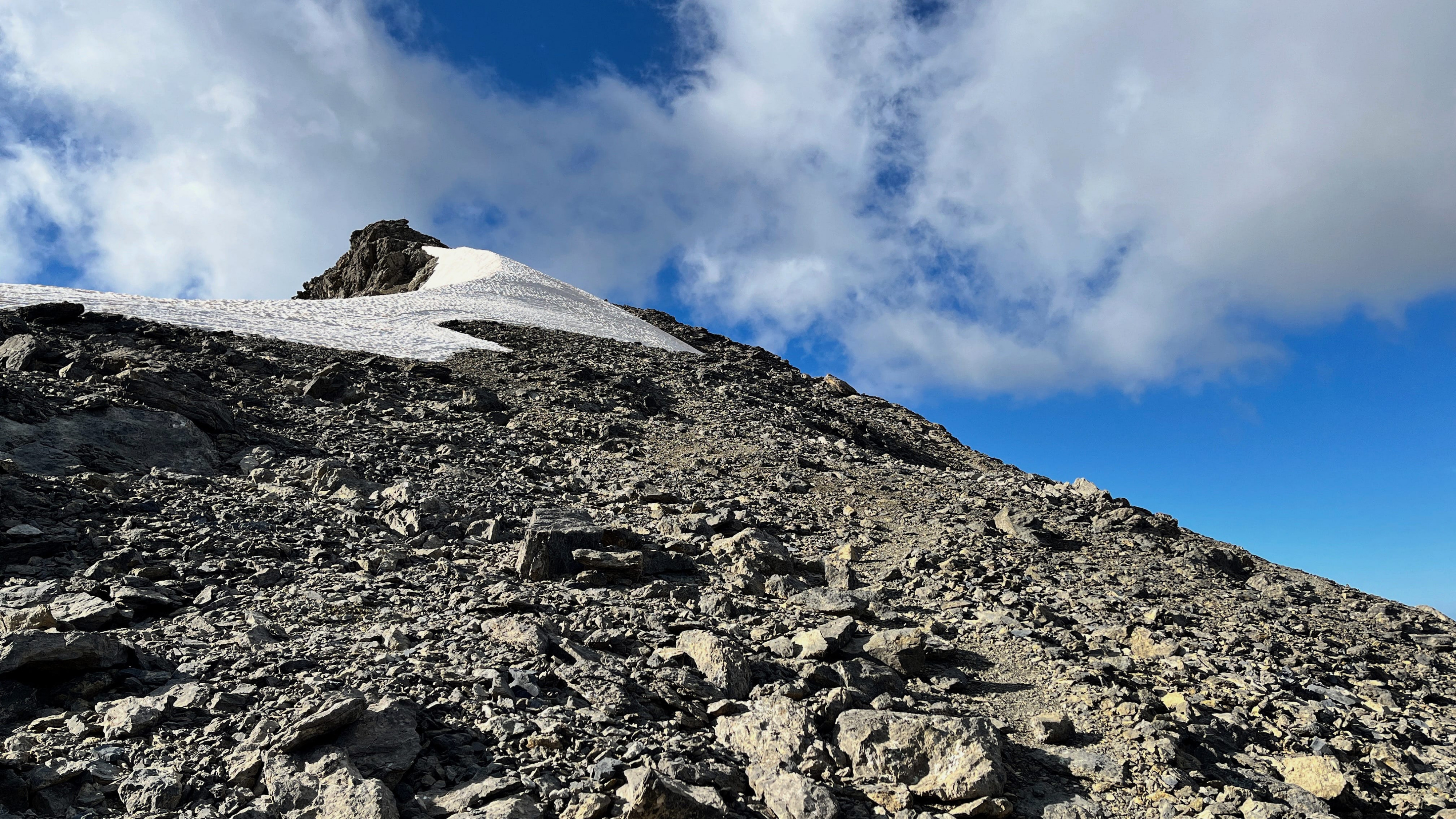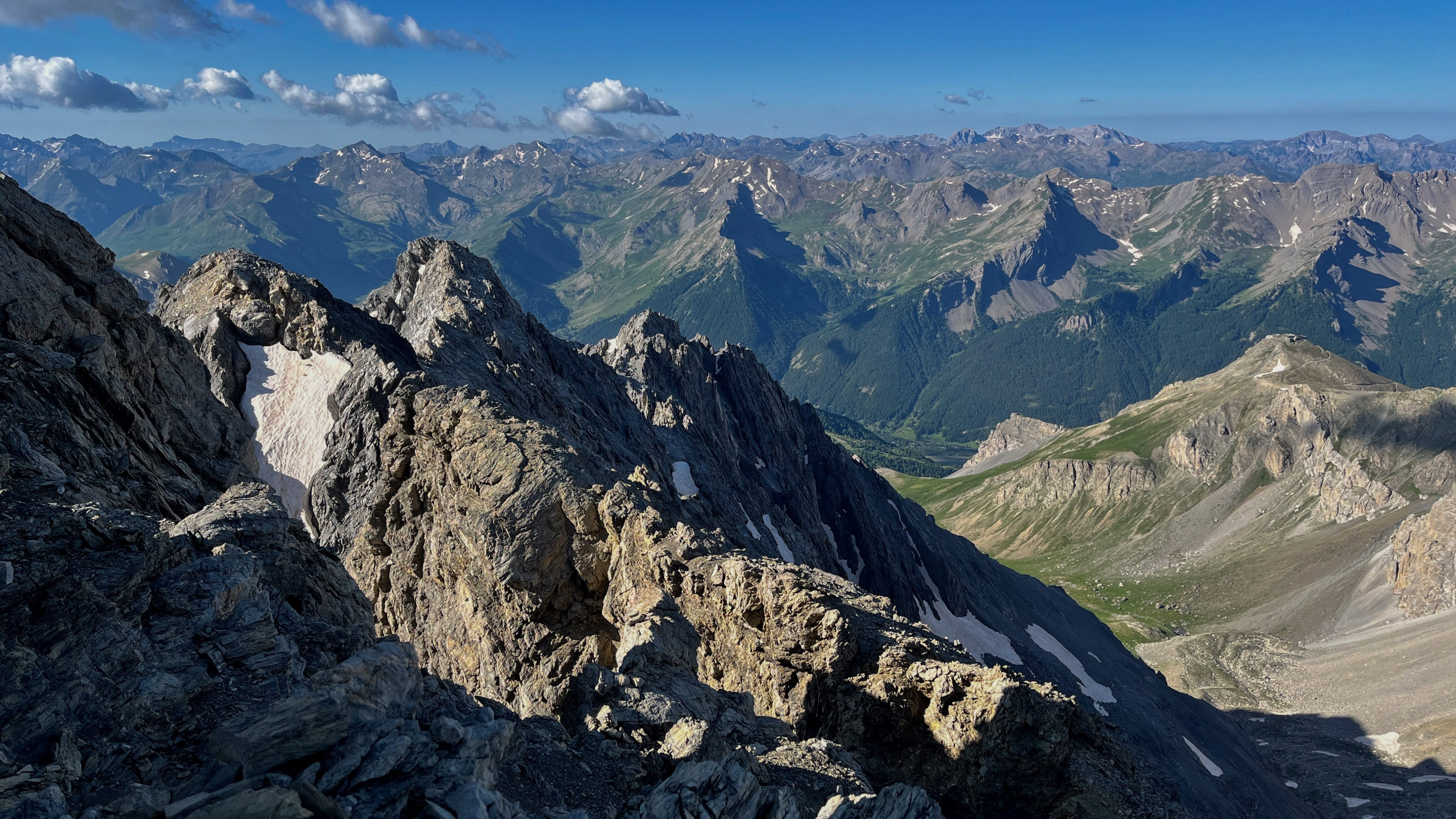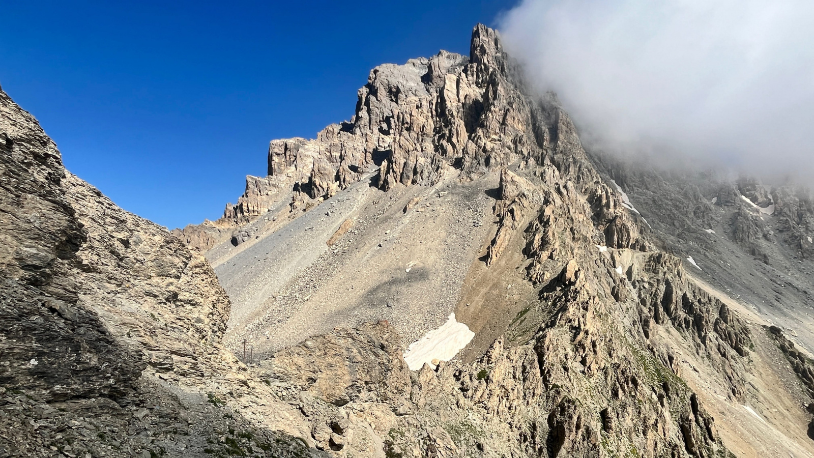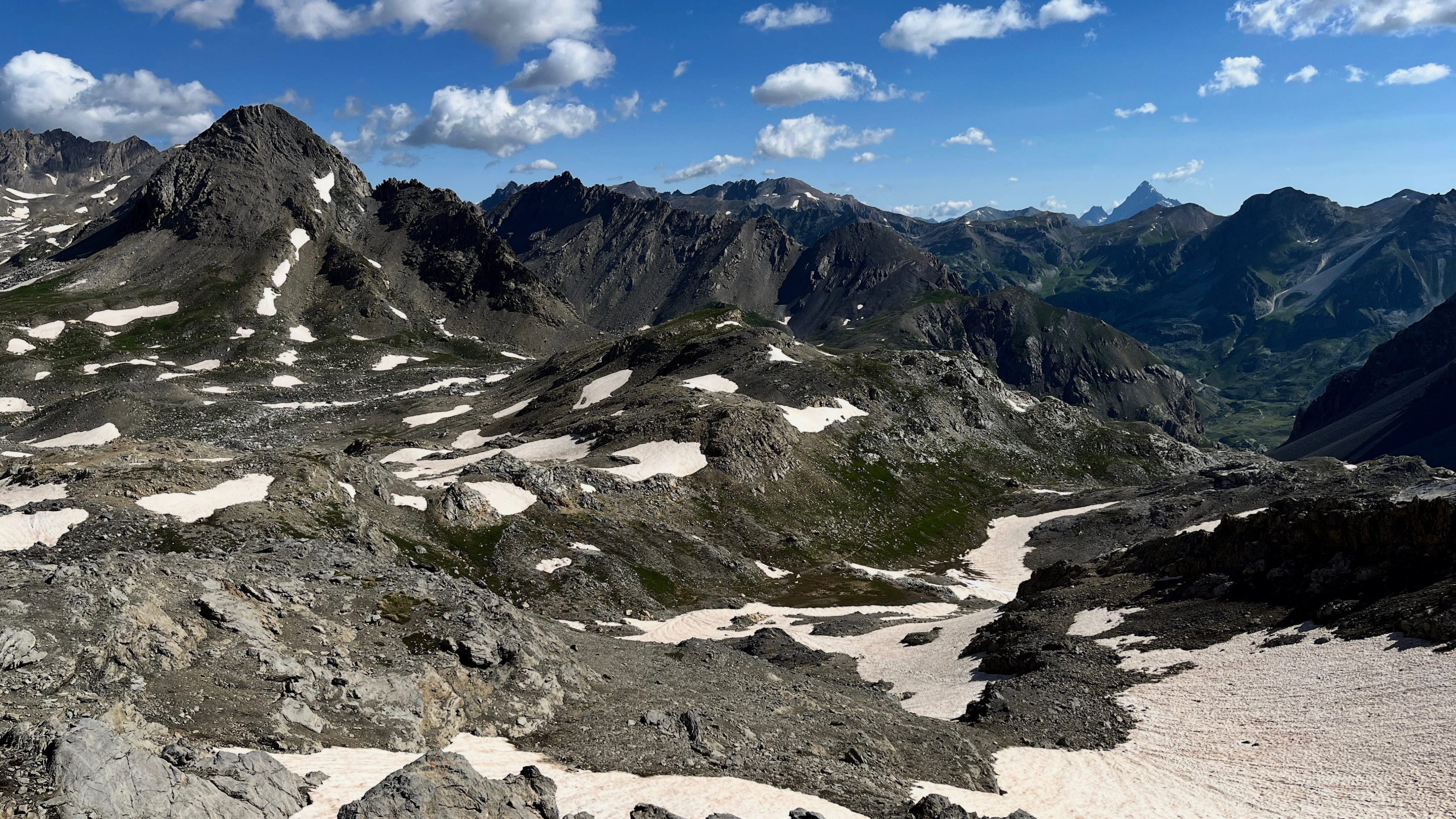 So langsam neigt sich diese Tour dem Ende zu, aber vorher geht es nochmal etwas hinauf, und zwar wieder recht steil auf losem Schutt. Mit viel Gewicht, bei mir mehr Rucksackgewicht als Körpergewicht, nicht unbedingt zu empfehlen. Aber nach einiger "Arbeit" stehe Ich oben auf dem Pass, dem Colle Feuillas (2749m), der Grenze zu Italien. Ich habe von hier eine gute Sicht nach Osten ins Tal, im Nordhang liegt auch hier noch einiges an Schnee.