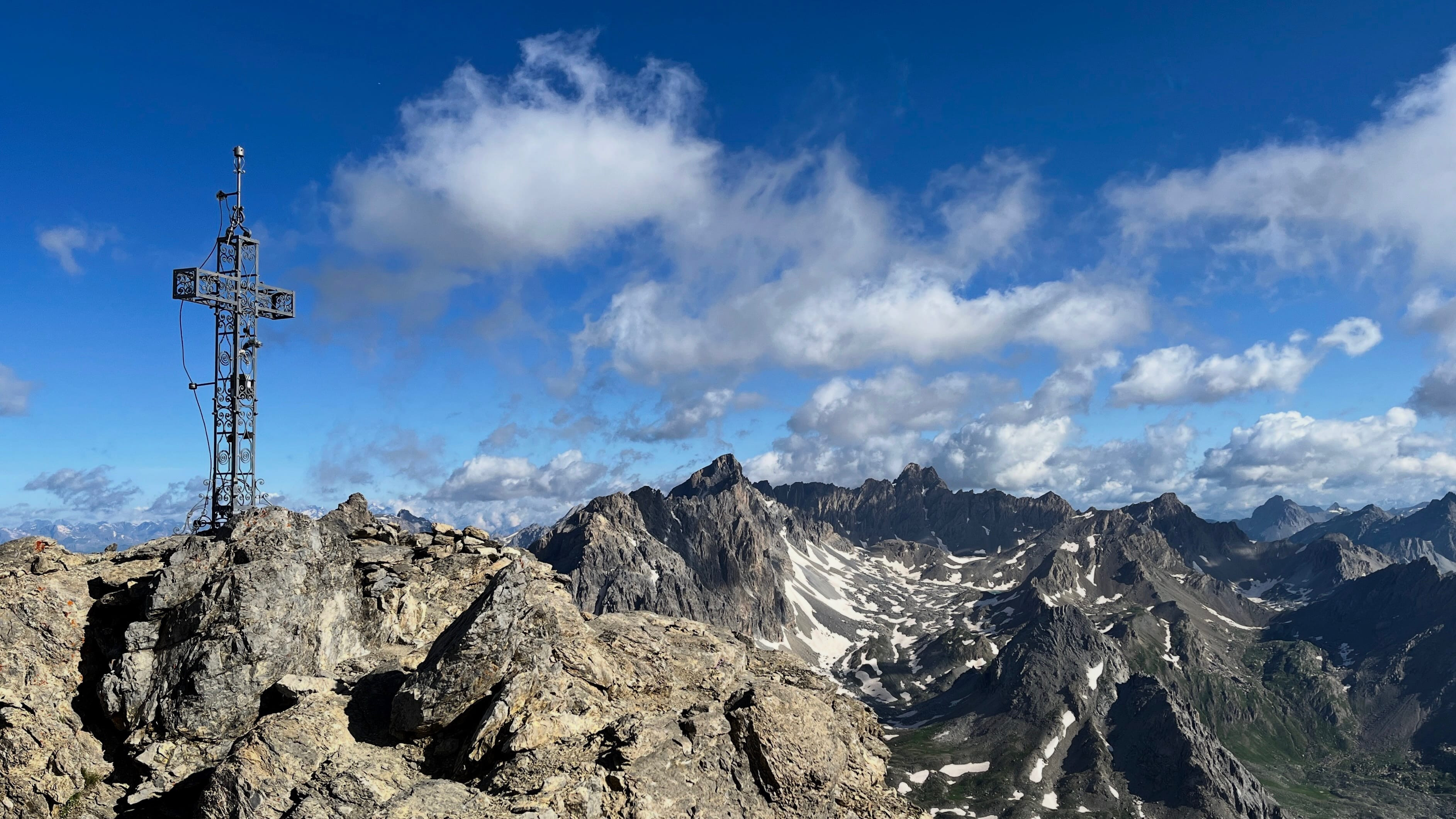 Eine knappe Stunde später stehe Ich oben am Gipfelkreuz, die Aussicht ist atemberaubend. Spektakulär!? Ja sicher. Aber, und das habe Ich auch immer wieder in den letzten Jahren bei mir festgestellt, mir sind es zu viele, zu starke Eindrücke. Ich fühle mich wie erschlagen. Weniger ist mehr. Auch bei Aussichten und Eindrücken. So suche Ich mir ein windgeschütztes Plätzchen, freue mich über den schönen Abstecher hier her, mampfe meine beiden Schokoriegel und mache mich wieder an den Abstieg.