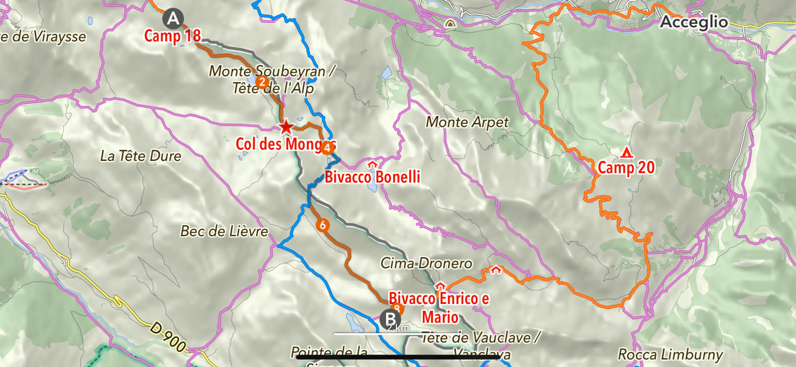 Zunächst geht es auf einem etwas ausgesetzten Pfad (T3) hinab zum Bivacco Enrico e Mario, das schon nach wenigen Metern unterhalb des Passes in mein Sichtfeld kommt. Es ist spartanisch ausgestattet mit einigen Stockbetten, bietet aber robusten Schutz. Bis jetzt war Ich noch etwas unschlüssig wo Ich meine Tour beenden werde, hier fährt ja nicht überall und jeden Tag ein Bus. Nachdem Ich weiter runtergestiegen bin und an der Abzweigung Richtung Colle della Scaletta den Schnee "inspiziere", hartgefroren, entscheide Ich mich spontan weiter ins Tal zu gehen, und als Ich ausreichend Netz habe finde Ich eine Busverbindung von Acceglio aus. Das sind von hier noch ca. 15 km. So wird das heute wohl mein letzter Wandertag sein.