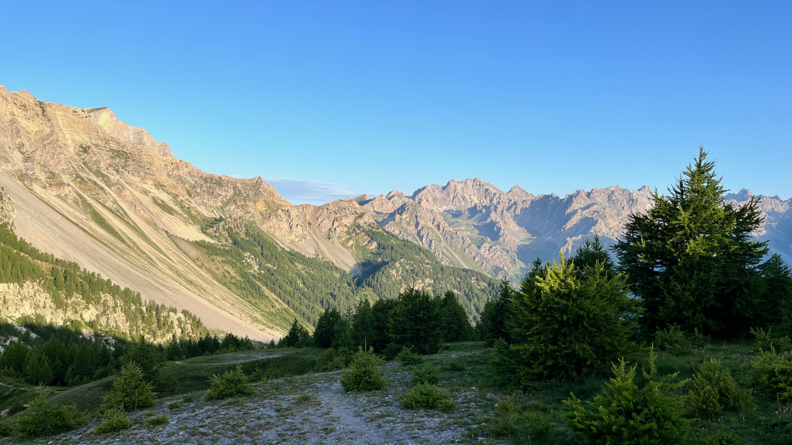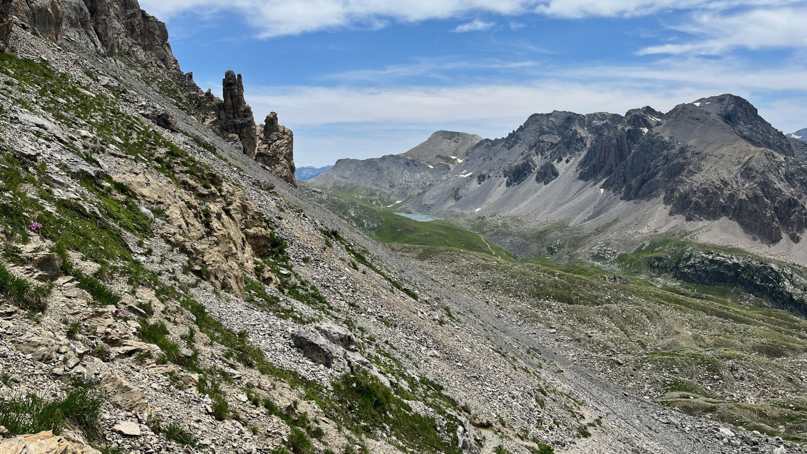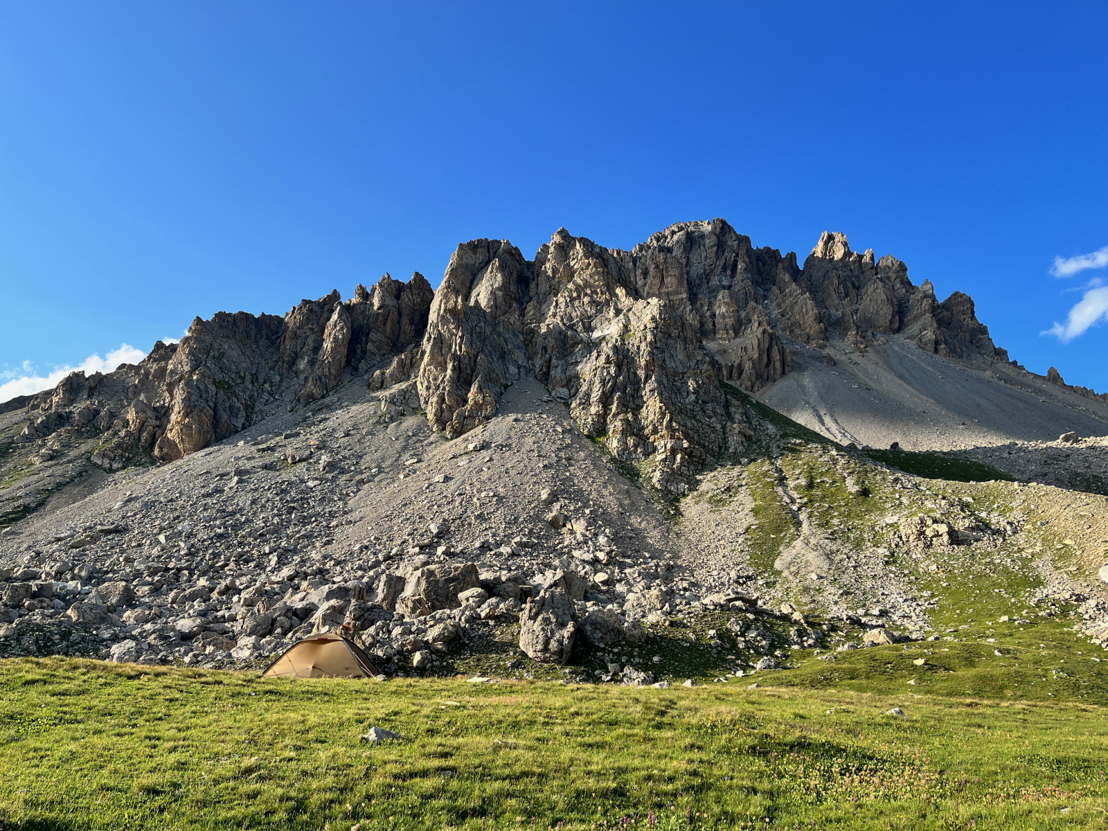 Dann stehe Ich auf dem Col Sautron. Den Pfad den Ich eigentlich über den Pass La Forcellina nehmen wollte ist kaum zu erkennen und scheint ziemlich ausgesetzt. Ich bin froh über meinen kleinen "Umweg". Mittlerweile wäre es sinnvoll mal nach einem Zeltplatz Ausschau zu halten. Ich könnte von hier etwas nach Westen runtersteigen Richtung Lac de Viraysse, aber bei näherer Betrachtung fällt mir auf das dort schon einige Zelte stehen. Außerdem liegt der See bereits im Schatten.