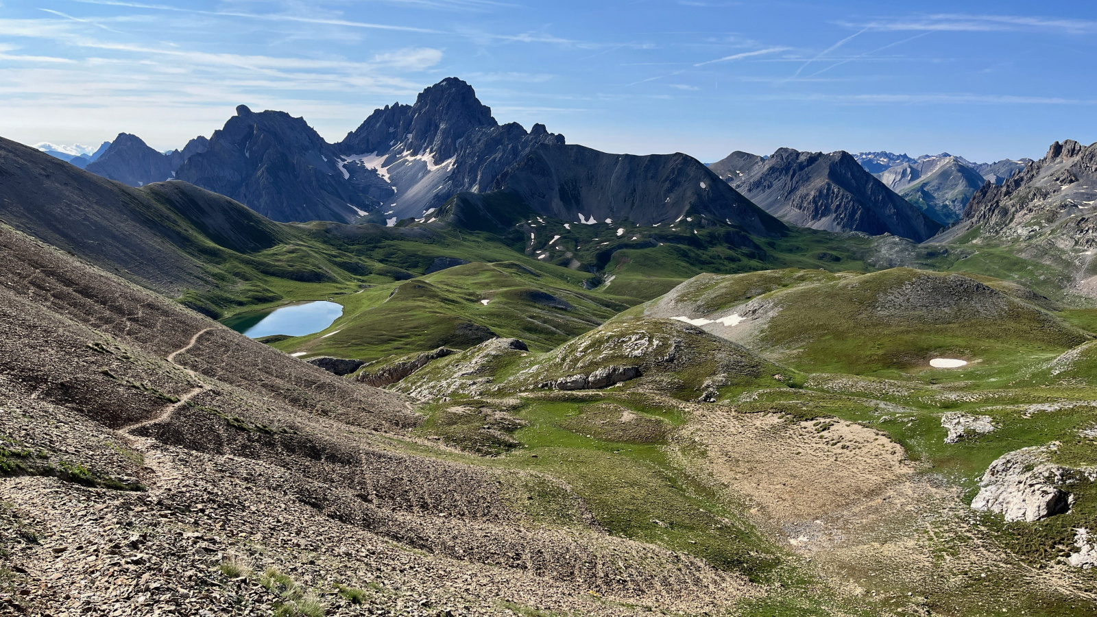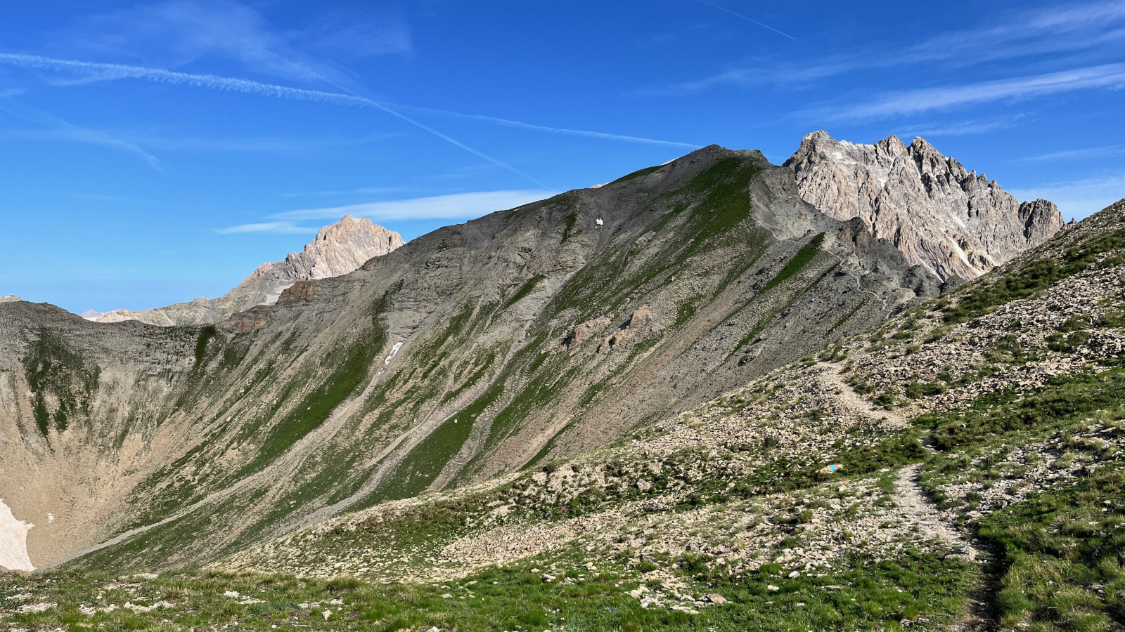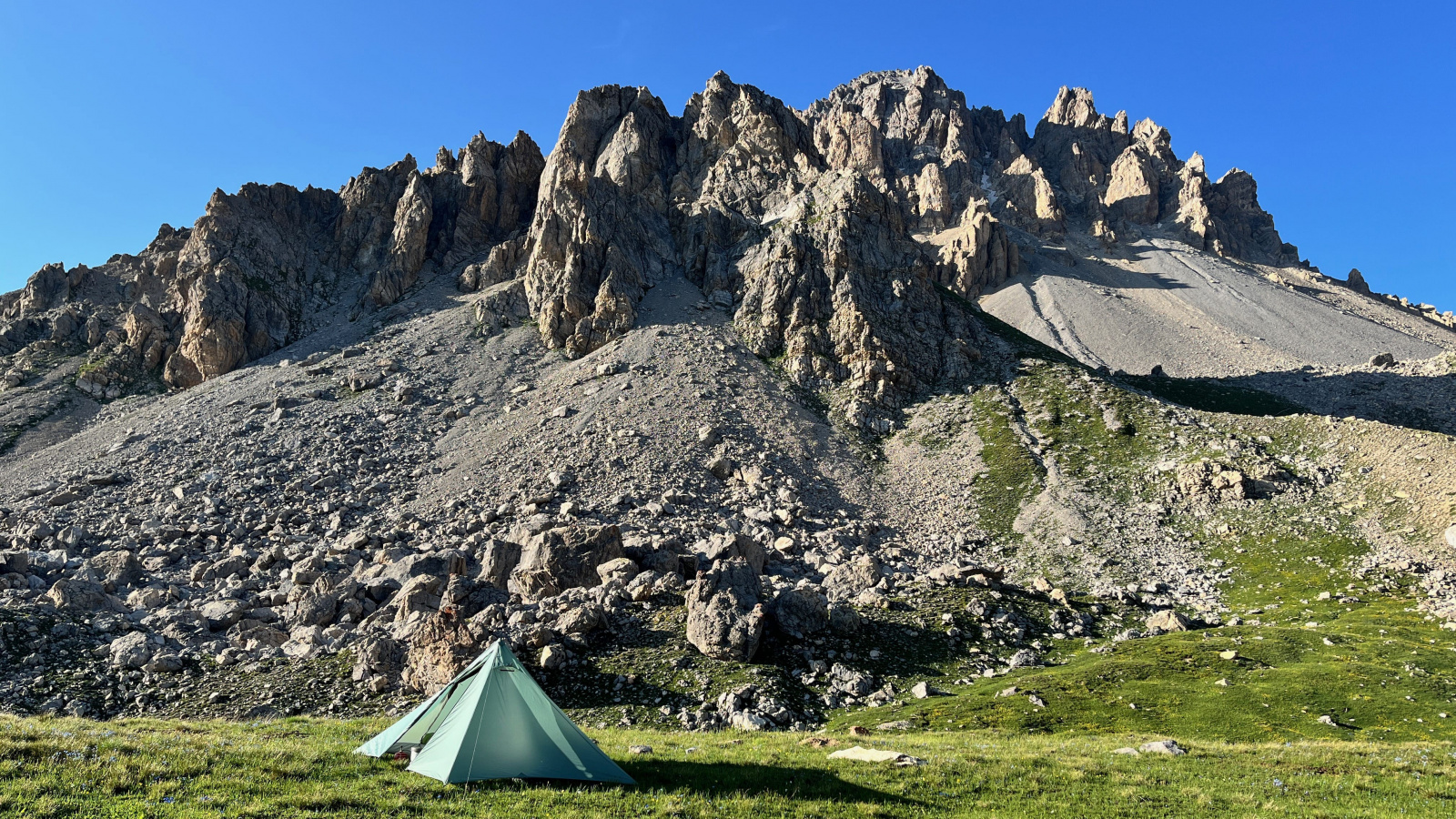 Dann stehe Ich auf dem Col Sautron. Den Pfad den Ich eigentlich über den Pass La Forcellina nehmen wollte ist kaum zu erkennen und scheint ziemlich ausgesetzt. Ich bin froh über meinen kleinen "Umweg". Mittlerweile wäre es sinnvoll mal nach einem Zeltplatz Ausschau zu halten. Ich könnte von hier etwas nach Westen runtersteigen Richtung Lac de Viraysse, aber bei näherer Betrachtung fällt mir auf das dort schon einige Zelte stehen. Außerdem liegt der See bereits im Schatten.