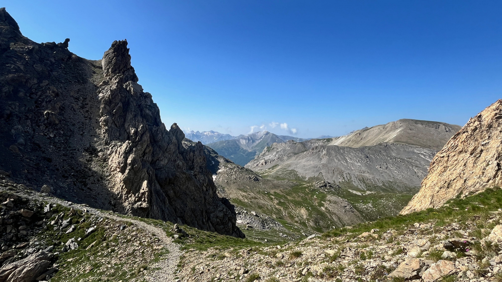Heute wird es vermutlich ein kurzer Tag. Ich möchte einen Ort erreichen an dem Ich letztes Jahre schon gezeltet hatte und schon damals dachte Ich das Ich gerne hier wieder zurückkehren möchte. Irgendwann. Ich lass mir also viel Zeit, gehe nochmal den Pfad etwas zurück und habe einen wunderbaren Blick auf den Monte Sautron, den Pass über den Ich gestern hochgestiegen war, und natürlich nach Südost, meine Richtung für heute.