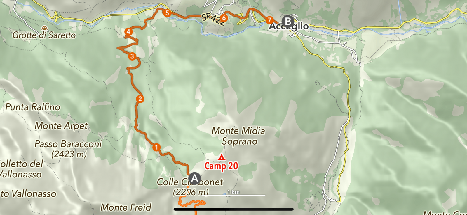 Ich folge der Straße talabwärts, vorbei am Campo Base Campingplatz. Hier, aus Nordost, kam Ich letztes Jahr vom Colle Rui hinunter. Die nächsten Kilometer folge Ich also dem Weg den Ich 2023 auch schon gegangen bin. Vorbei an dem Ort Chiappera, dann rechts ab auf einem schönen Pfad der mich wieder hinauf führt zum Col Sautron. Ich komme an einer kleinen "Kuppe" vorbei und erinnere mich das Ich letztes Jahr schon drauf und dran war dort mein Zelt hinzustellen. Ich tat es damals nicht, und auch dieses mal ließ Ich diese "Links" liegen und ging weiter.