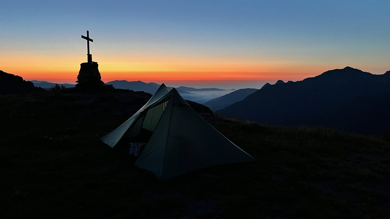 Von hier führt ein Pfad hinauf zum Monte Midia Soprano, das sieht gut aus um dort zu zelten. Es sind Weideflächen, aber keine Tiere weit und breit zu sehen-dafür aber mal wieder viele anderer Insekten. Als Ich einen halben Kilometer vor dem Gipfel an einer ebenen grasbewachsenen Fläche in der Nähe eines Kreuzes vorbeikomme ist für mich die Sache klar: Hier bleibe Ich. Es ist ein guter Ort für die letzte Nacht. Ich habe einen schöne Blick in alle Himmelsrichtungen, nur den Himmel über mir.