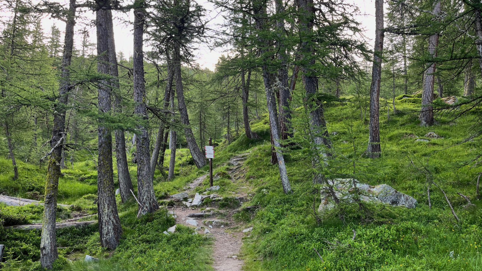 Am Morgen, es ist der 16. Juli 2024, der 18. Tag meiner Wanderung, scheint mal wieder die Sonne. Es ist windstill, auch sonst Still, blauer Himmel, leicht bewölkt. Schon gestern Abend habe Ich hier einige Markierungen gesehen die hinauf auf den Monte Sautron führen und über Nacht ist die Überlegungen bei mir aufgekommen mal hochzusteigen. Sofern Ich nicht über den Col de Portiola (T5) gehe ist der Aufstieg auf meiner Karte mit T2 angegeben. Spontan ziehe Ich mich warm an, nehme meine Flasche Wasser, zwei Schokoriegel und meinen Stock zur Hand und mache mich auf den Weg. Das Zelt lasse Ich hier unten stehen.
