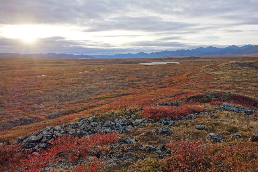 Am Abend auf der Passhöhe (rund 1300 m) dann doch noch ein freundlicher Moment mit etwas Sonnenschein. In der Ferne sehen wir einen Ewenen mit ein paar Rentieren durch die Tundra wandern.