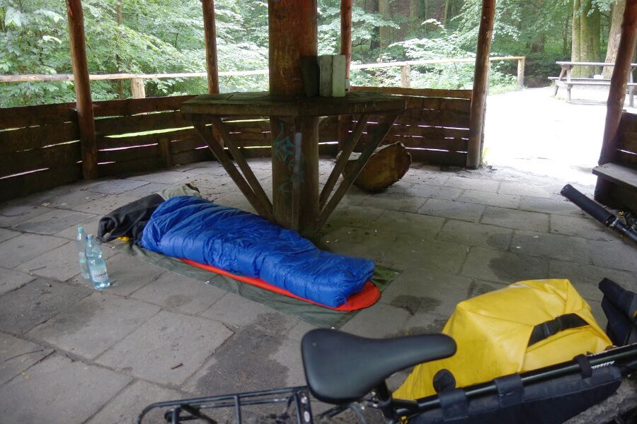 Als ich am nächsten Morgen meine Ausrüstung ausbreite, stelle ich mit Erschrecken fest, dass sich die Füßlinge meines Trockenanzugs anfangen aufzulösen. Beim Einrollen in Berlin, waren sie noch in Ordnung, doch jetzt scheint es irgendeine chemische Reaktion zu geben, und zwar an jener Stelle, an der ich vor drei Jahren mal einen Flicken mit Klebeband abgesichert habe... Naja, nach 10 Jahren regelmäßiger Nutzung darf so etwas schon mal passieren. Da sich das Ganze nun in eine klebrige Schmiere verwandelt und dadurch auch nicht wirklich flicken lässt, schneide ich die Füßlinge komplett ab und hoffe, dass ich auf dieser Tour nicht wirklich darauf angewiesen sein werde...