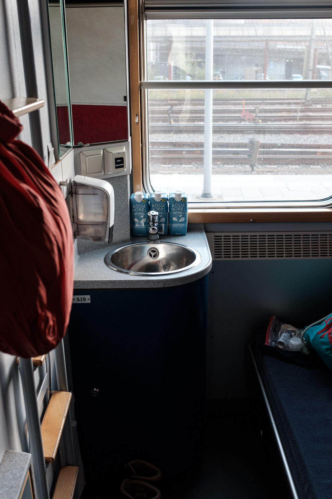 Ich habe mir ein Bett in einem 3er Schlafabteil gegönnt und da außer mir noch niemand im Abteil ist, wuchte ich meinen – mit fast 18kg doch etwas schwerer als geplanten – Rucksack ganz oben neben mein Bett in die Gepäckablage. Viel Platz ist dort echt nicht, der Rucksack passt gerade so eben hinein. Das Abteil ist zwar super beengt, ich bin dennoch total begeistert und schlafe in der Nacht richtig gut. So ein Nachtzug ist in meinen Augen das perfekte Reisemittel.