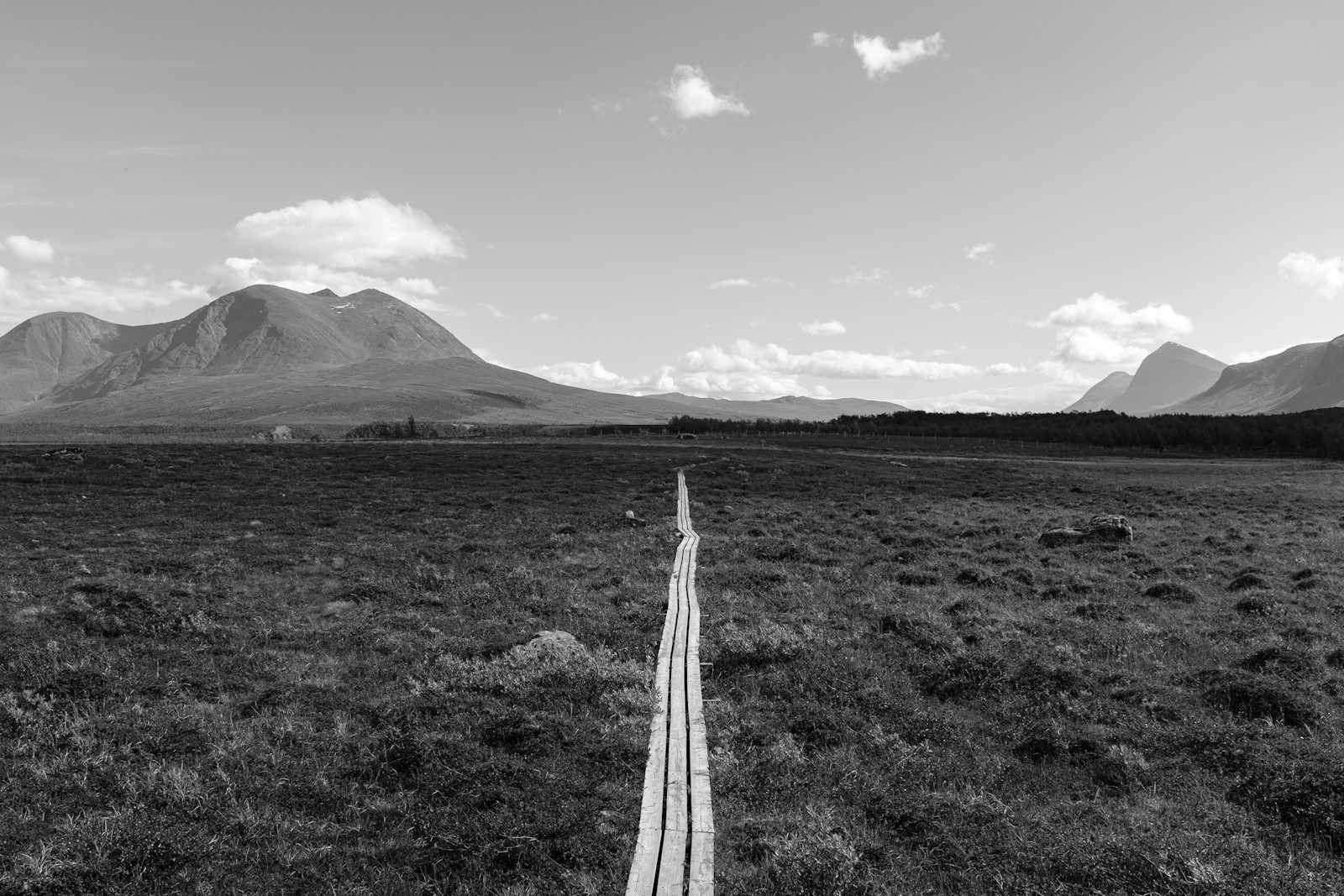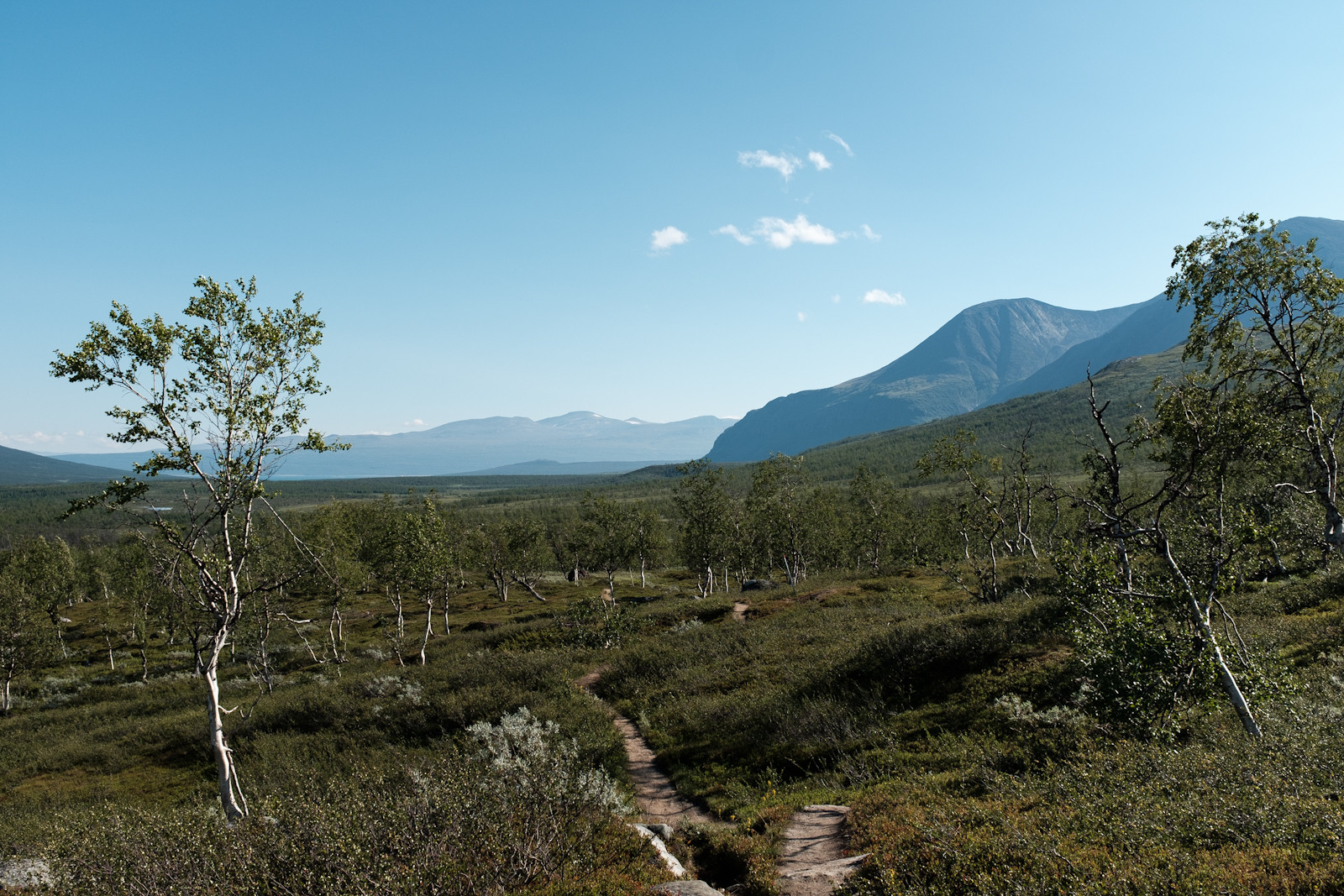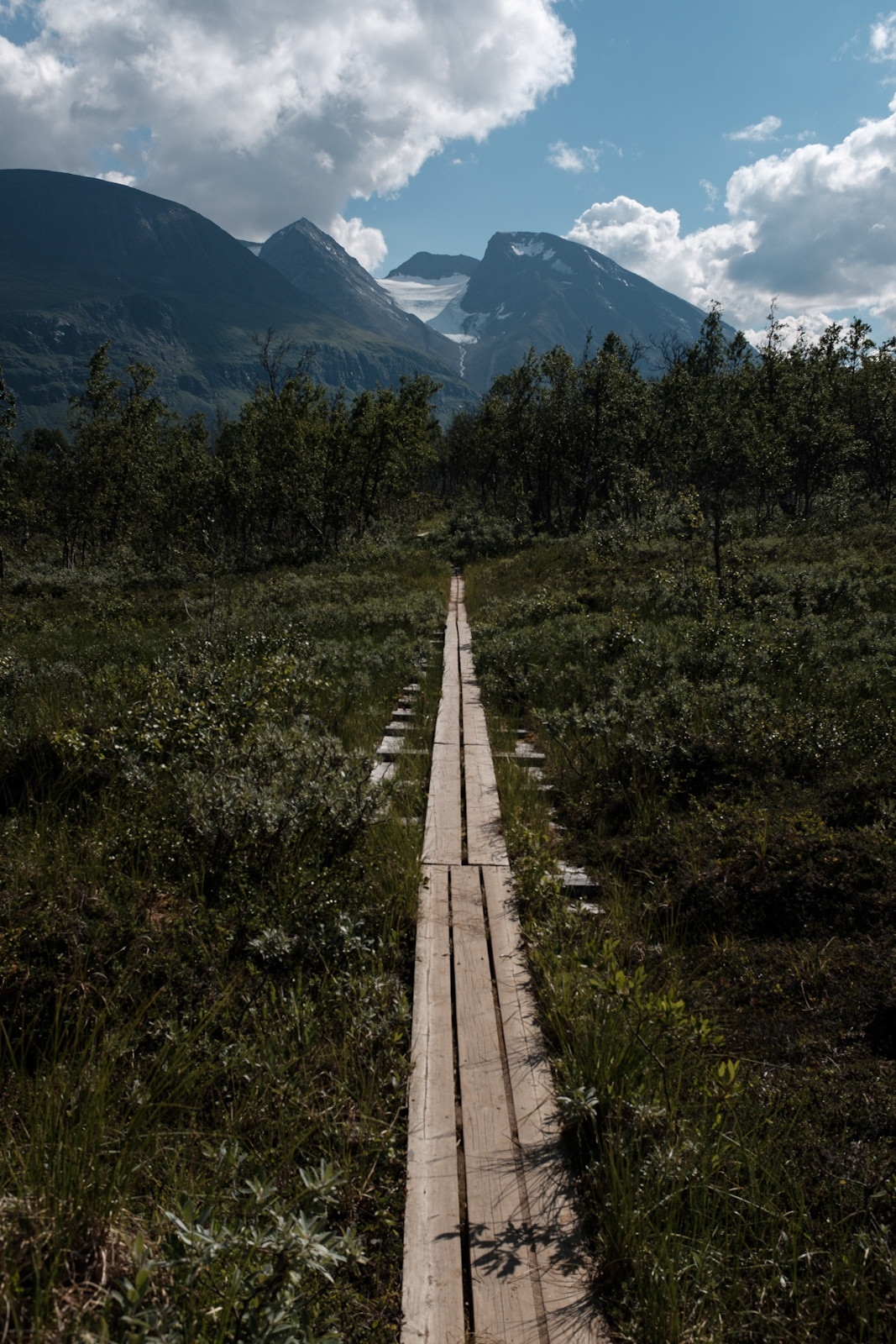 Ziemlich beschwingt laufe ich über die Pfade und Bohlenwege durch die lichten Birkenwäldchen, den Akkajaure im Rücken und den Blick immer auf das Áhkkámassiv gerichtet.
