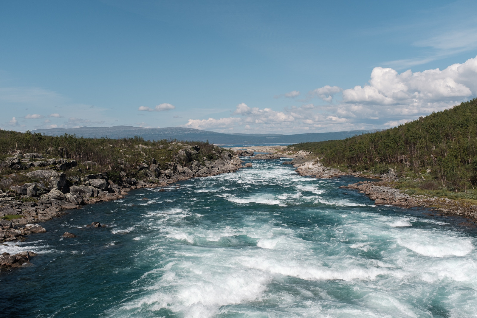 Schneller als erwartet passiere ich die Akkahütten und höre schon das ferne Rauschen des Vuojatädno, den ich über die große Hängebrücke passiere. Hier mache ich erstmals kurz Rast und genieße den Blick auf das rauschende Wasser.