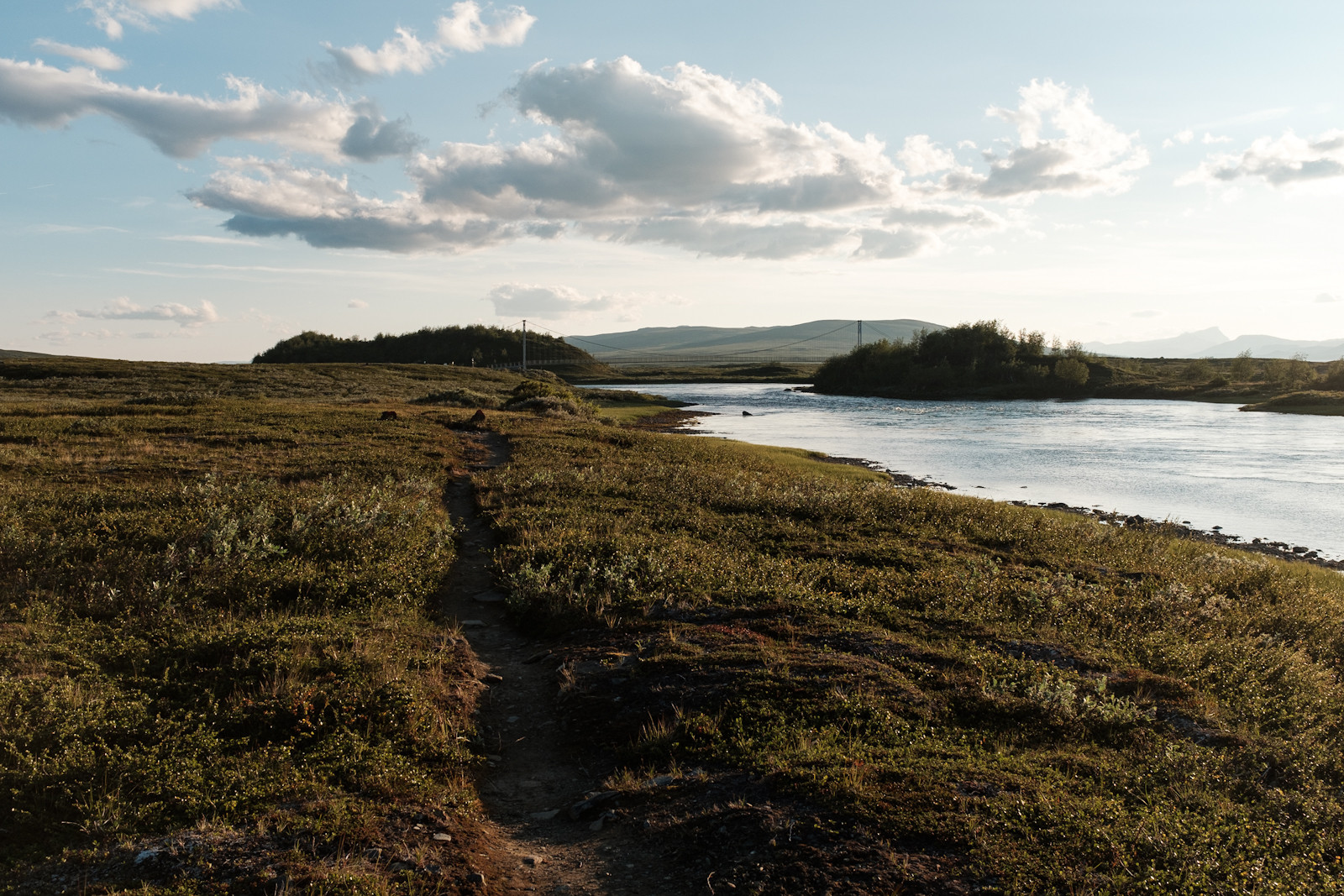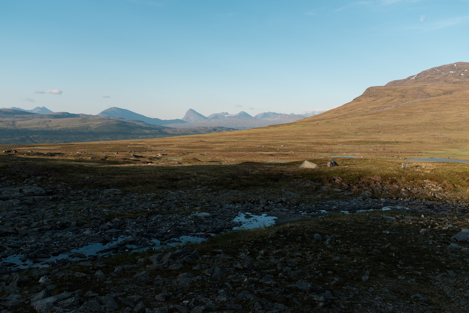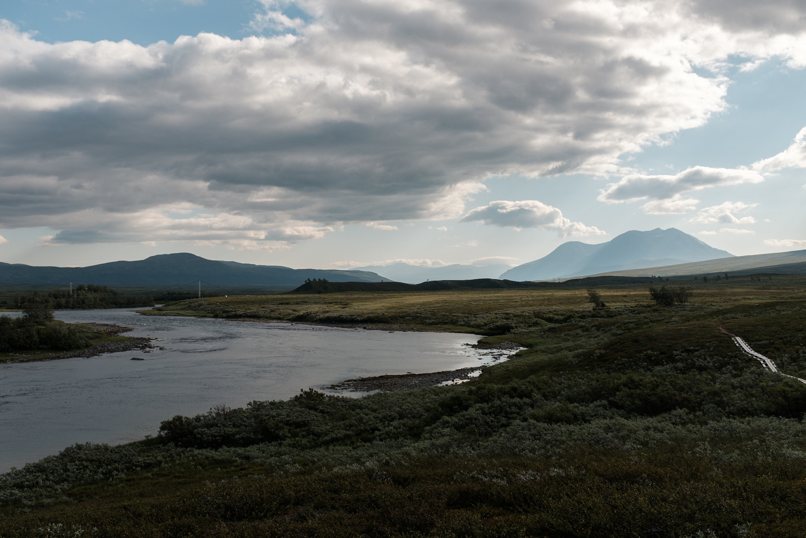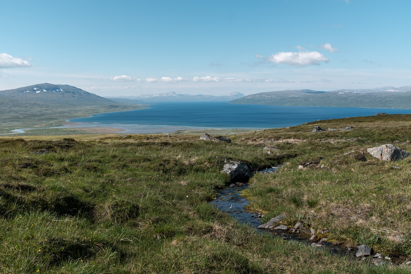 Ich gehe weiter und erfreue mich an den tollen Ausblicken über den Fluss zu meiner Rechten und das Áhkkámassiv zu meiner Linken. Hier gäbe es viele schöne Zeltplätze, ich möchte allerdings noch weiter und außerdem geht mein Wasser langsam zur Neige. Kaum gedacht, treffe ich auf einen Bach und werde mir in den nächsten Tagen zunächst keine weiteren Gedanken über mögliche Wasserengpässe machen.