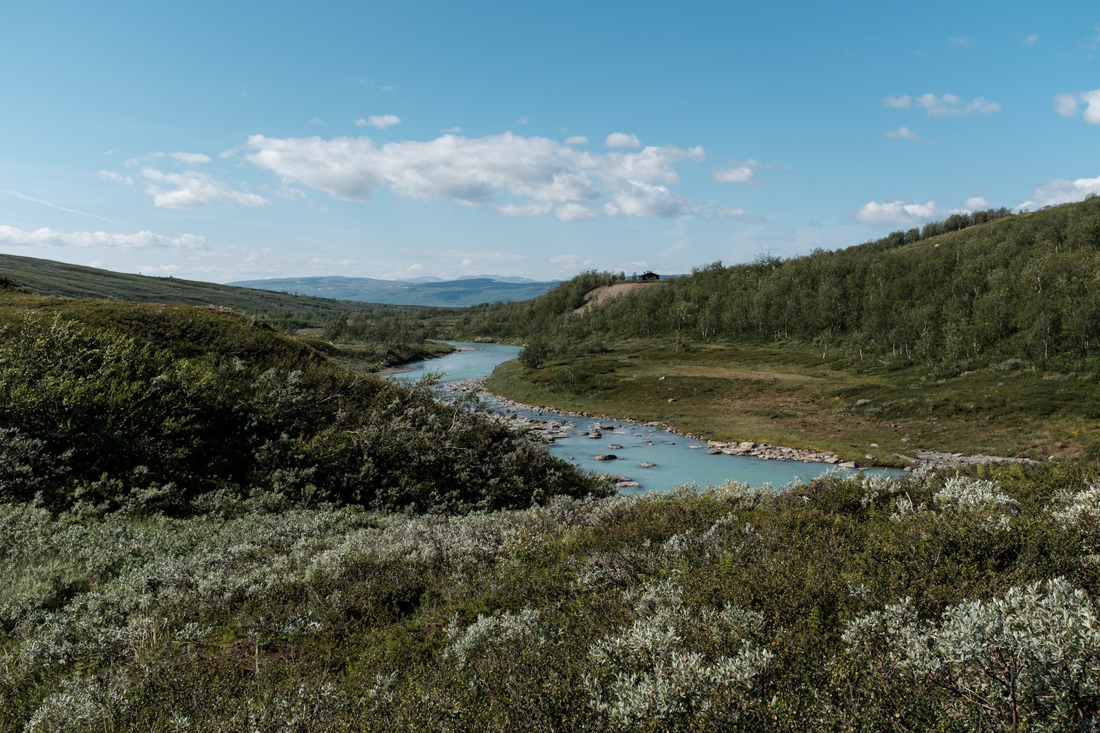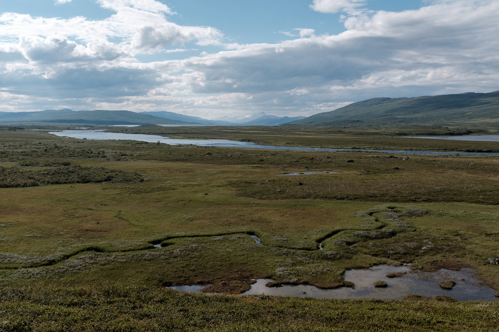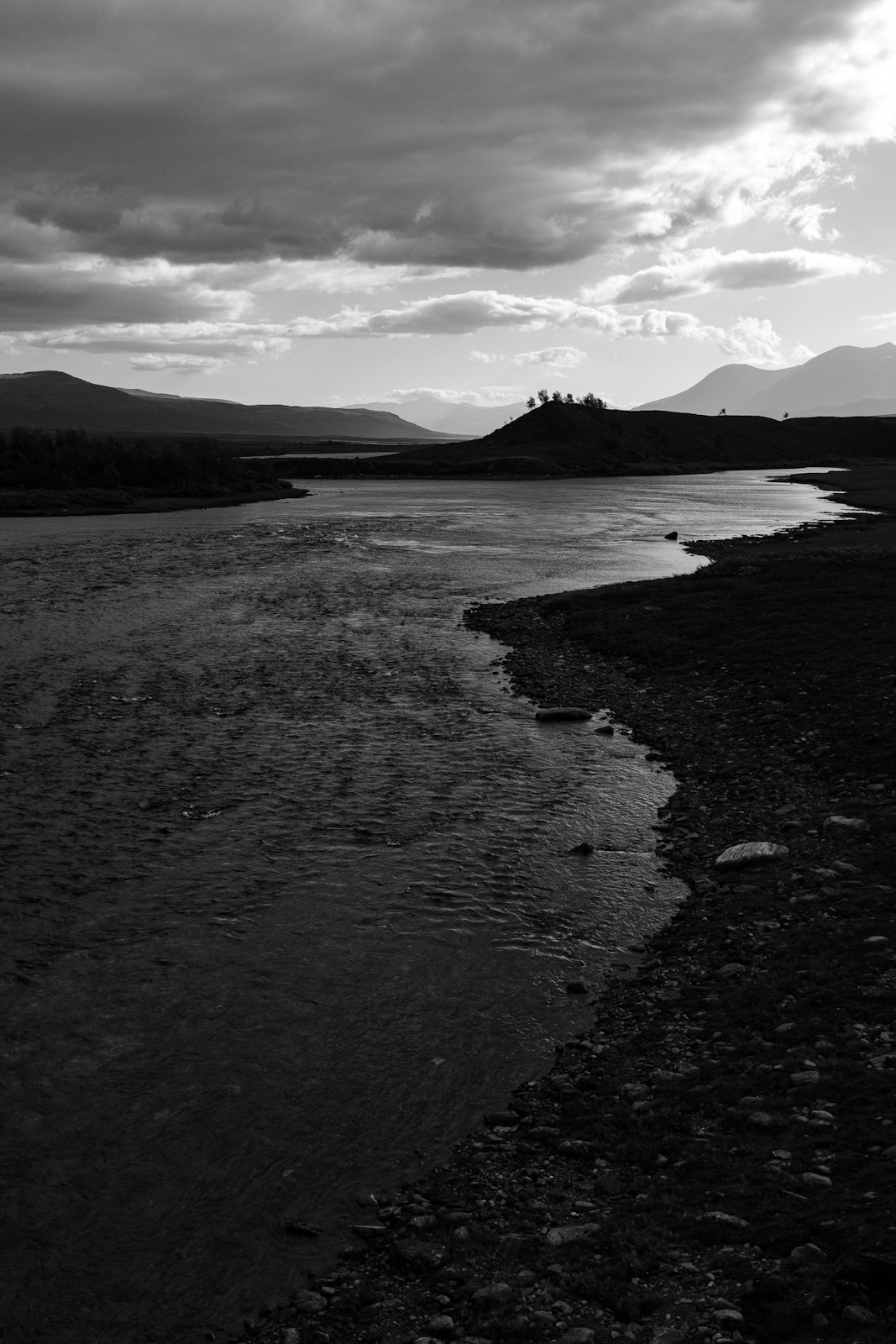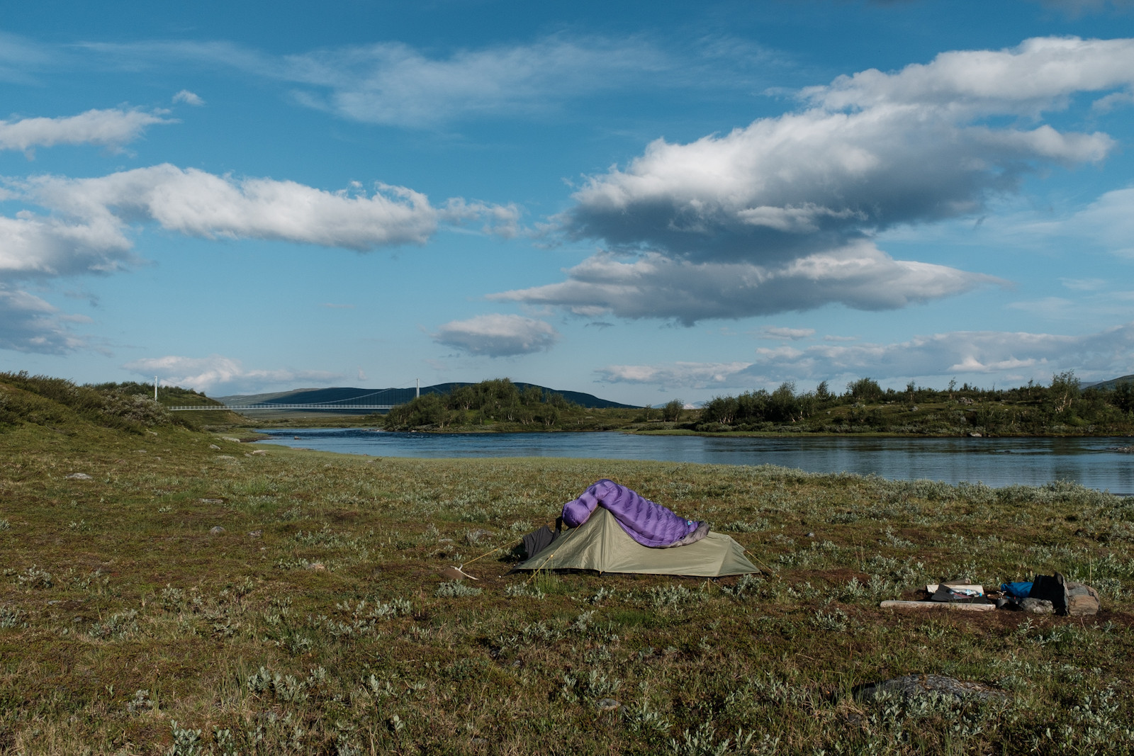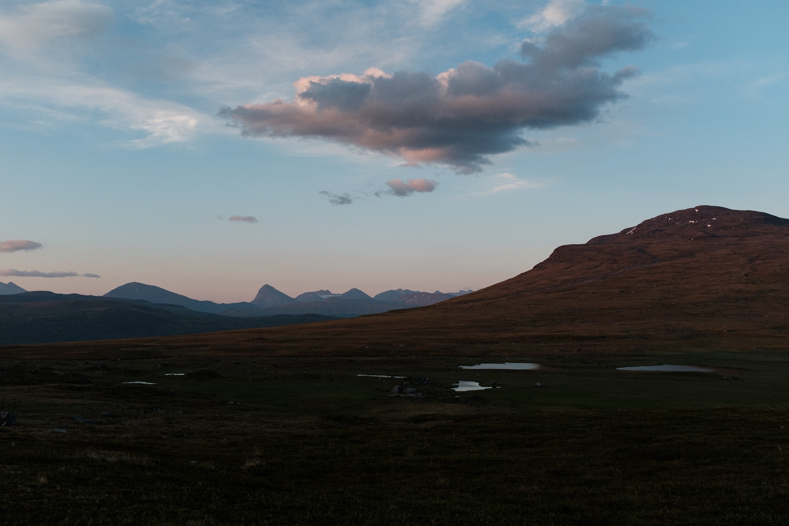 Ich gehe weiter und erfreue mich an den tollen Ausblicken über den Fluss zu meiner Rechten und das Áhkkámassiv zu meiner Linken. Hier gäbe es viele schöne Zeltplätze, ich möchte allerdings noch weiter und außerdem geht mein Wasser langsam zur Neige. Kaum gedacht, treffe ich auf einen Bach und werde mir in den nächsten Tagen zunächst keine weiteren Gedanken über mögliche Wasserengpässe machen.