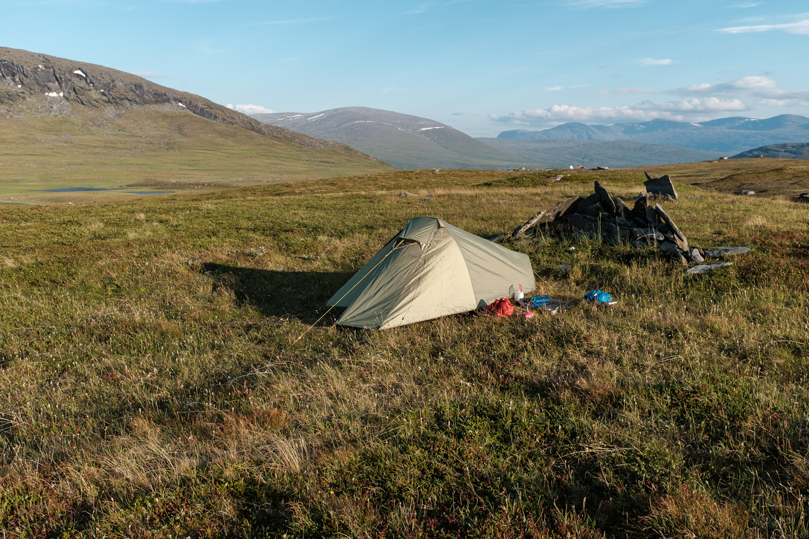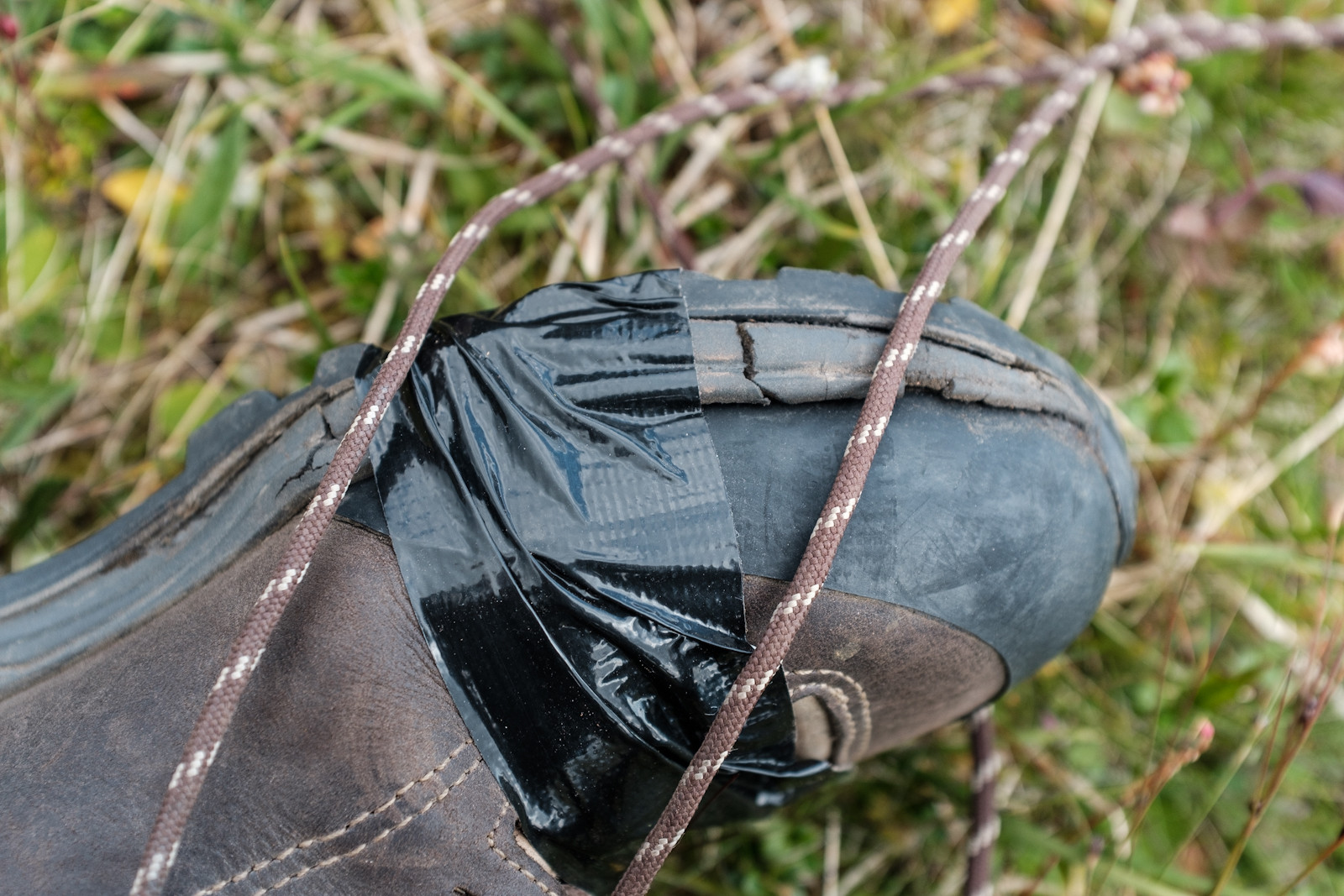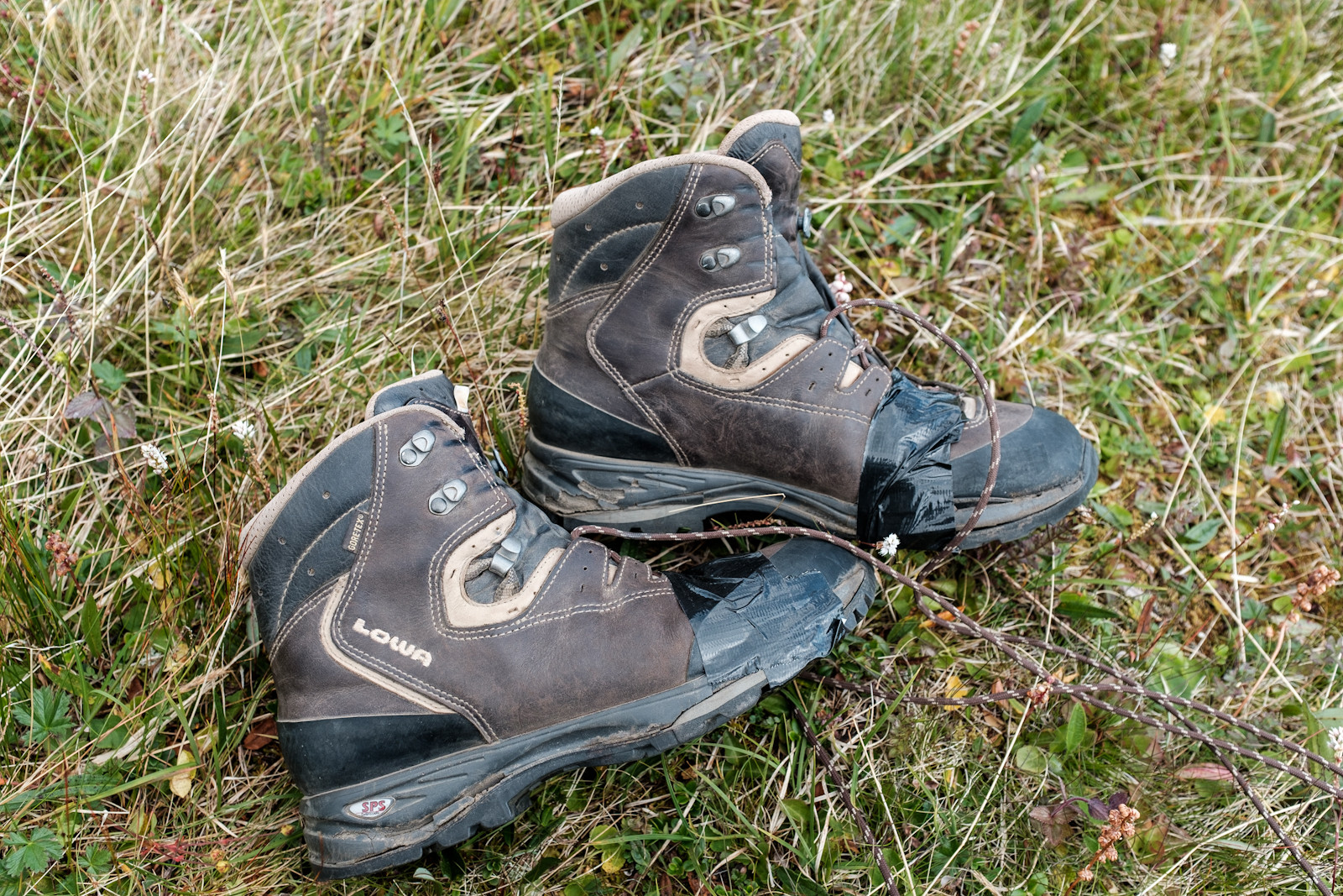 Da der Himmel weiter bedrohlich aussieht, begnüge ich mich mit einer Katzenwäsche und esse schnell mein Müsli im Zelt. Außerdem umwickele ich heute meine Schuhe vorne mit meinen letzten Resten Panzertape. Hinten löst sich die Sohle allerdings auch langsam, dort hätte man auch mit dem Tape dann keine Chance (es hält ja nicht am Leder sondern nur am Geröllschutz). Hoffentlich schaffe ich es so noch bis Stáloluokta!