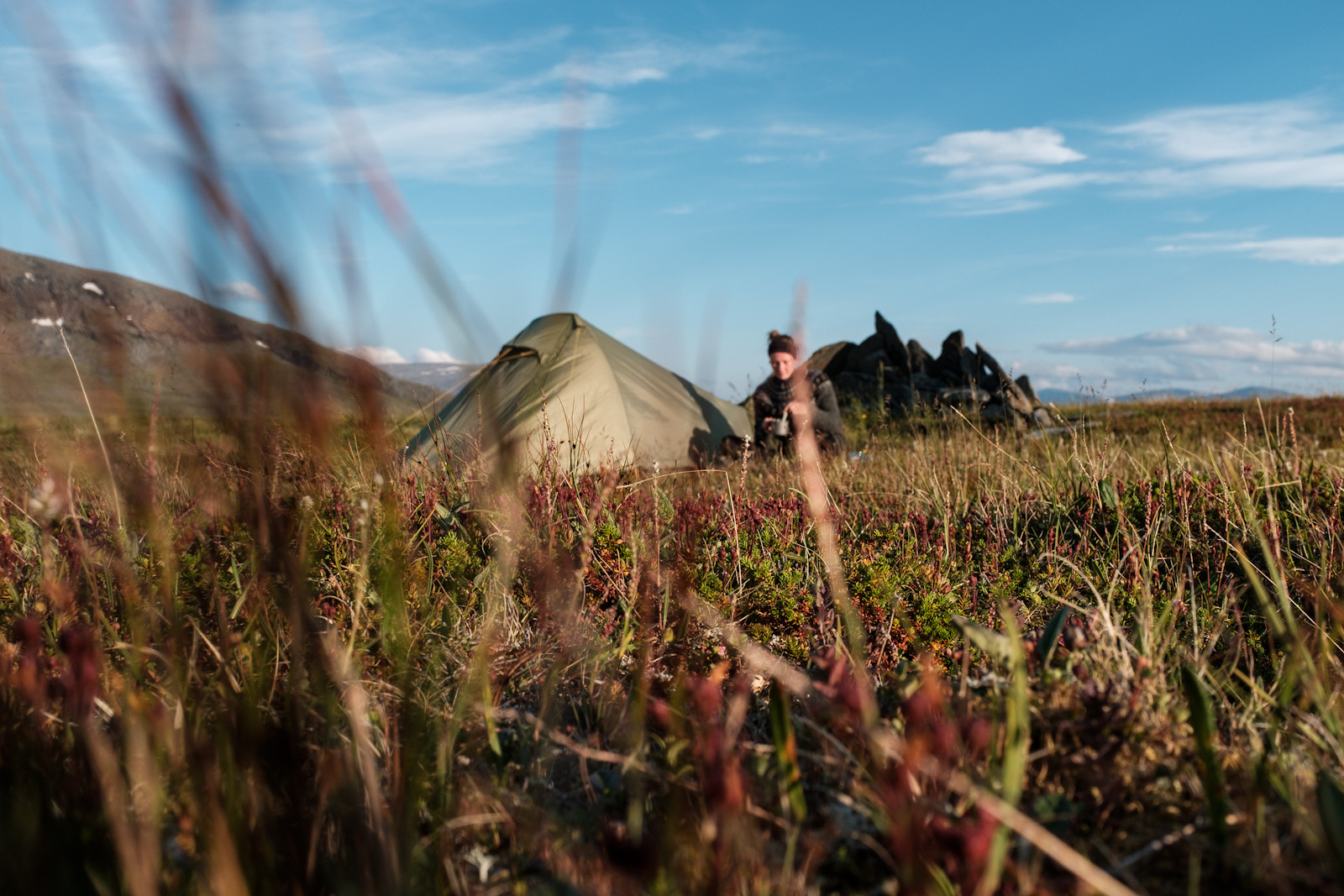 Die Nacht war regnerisch, da aber ein starker Wind weht, ist das Zelt schon fast wieder trocken, als ich gegen 6.30 Uhr aufstehe. Ich stecke den Kopf aus dem Zelt und erschrecke damit ein Rentier, das gemütlich in Zeltnähe gegrast hat und jetzt schnell weggaloppiert.