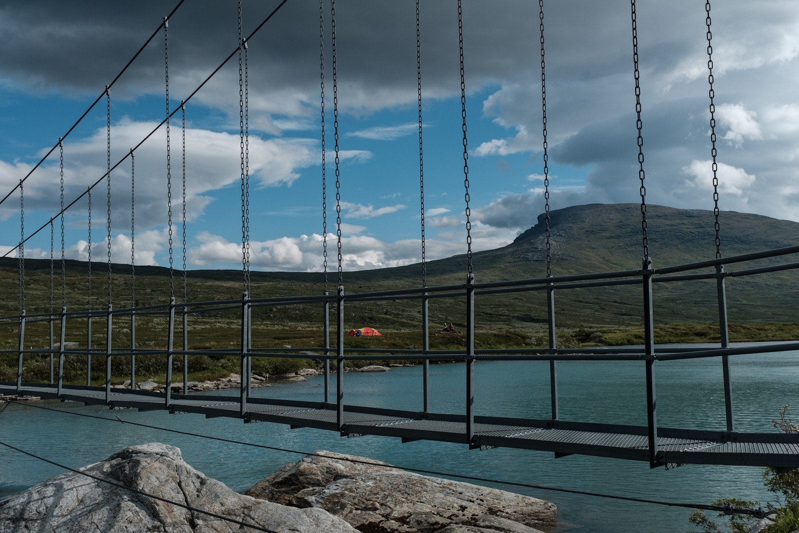 Nachdem ich heute noch niemanden gesehen habe, treffe ich an der Hängebrücke über den Miellädno dann gleich auf mehrere Wanderer und ein hübsches rotes Zelt, das sich optisch ausgezeichnet in dieser Landschaft macht. Generell kommen mir bis Árasluokta mehr Menschen entgegen, als die Tage zuvor, darunter auch viele Jugendliche, zum Teil in größeren Wandergruppen.
