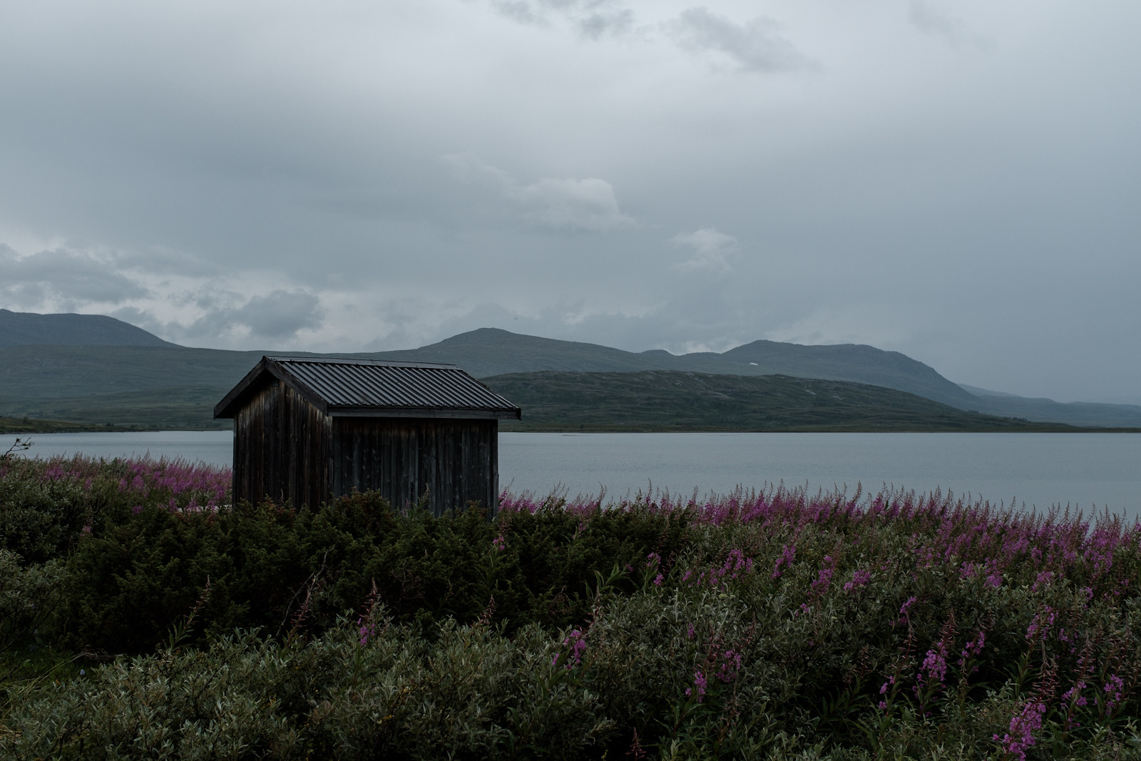 Je näher ich Stáloluokta komme, desto düsterer wird es und 2 km vor den Hütten fängt es dann tatsächlich richtig an zu regnen. Ich streife schnell den Regenschutz für den Rucksack und meine Regenjacke über und eile über die glitschigen Bohlen und schmalen Pfade hinab Richtung Siedlung. Meine Leggings ist aufgrund der nassen Büsche neben dem Weg schnell völlig durchnässt, da rächt es sich, dass ich zu faul war, die Regenhose auch noch anzuziehen.