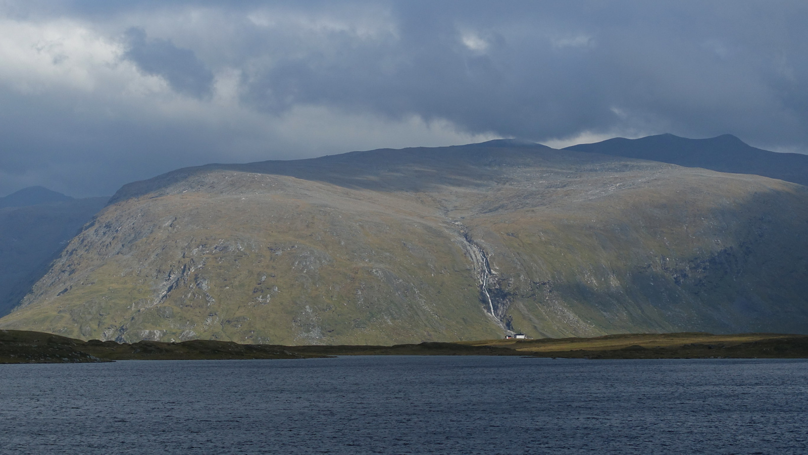 Von der Sonne beschienen liegt am anderen Ufer des Lulep Rissájávrre eine Rentierzüchterhütte. Auf dem Foto sieht es so aus, als ob sie direkt am Fuß des Wasserfalls erbaut wäre. Aber zwischen der Hütte und dem Fall liegt noch ein tiefes Tal, in dem die Grenze zwischen den Nationalparks Padjelanta und Sarek verläuft. Das habe ich übrigens ganz vergessen zu erwähnen: ich befinde mich schon einige Tage lang im Padjelanta-Nationalpark, kurz vor dem Pass mit der Silbermine habe ich ihn erreicht.