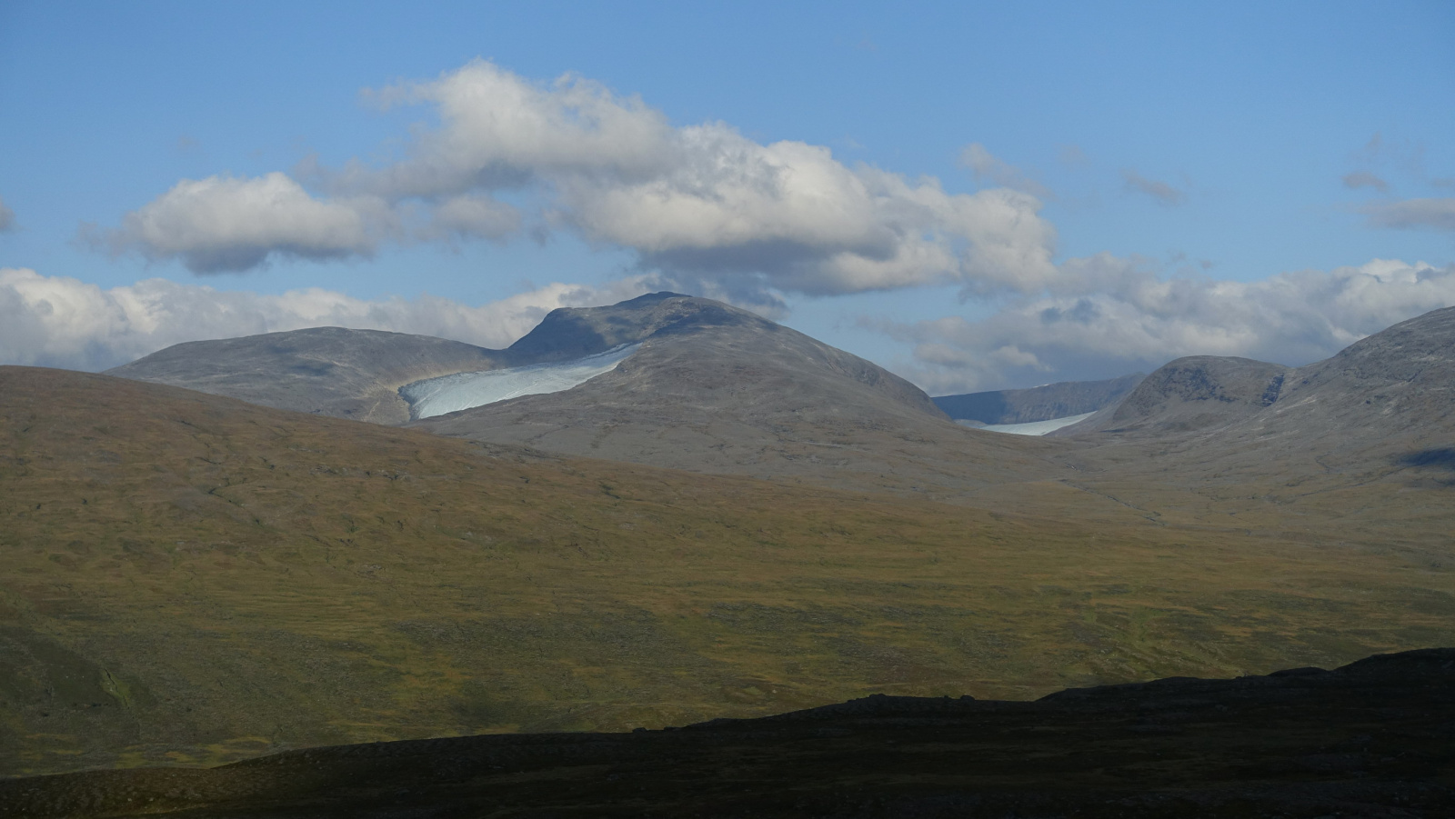 Wenn man von der norwegischen Seite der großen Padjelanta-Seen auf den Sarek schaut, sticht dieser Gletscher besonders ins Auge. Es ist der einzige Gletscher am Rand des Sarek, der in Richtung Norwegen zeigt.