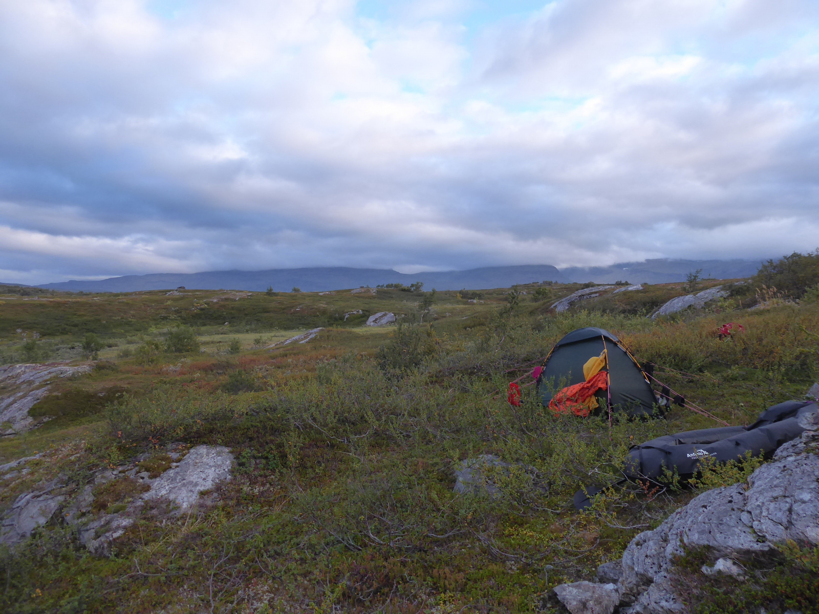Zwischen Bieggalouppal und Áhpparjávri suche ich mir einen schönen Zeltplatz am Ufer. Wenn das Wetter besser wird, kann ich ja morgen über den Áhpparjávri paddeln, dann muss ich nicht den ganzen Umweg über die Brücke bei den Alesjaurestugorna laufen.