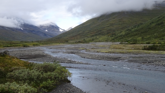 Und so ging es jetzt im Sarvesvágge nach Westen. Mal im Schotter des Flussbetts, mal über Gras- oder Weidenhügel, aber auch mal durch Birken- und/oder Weidendickicht.