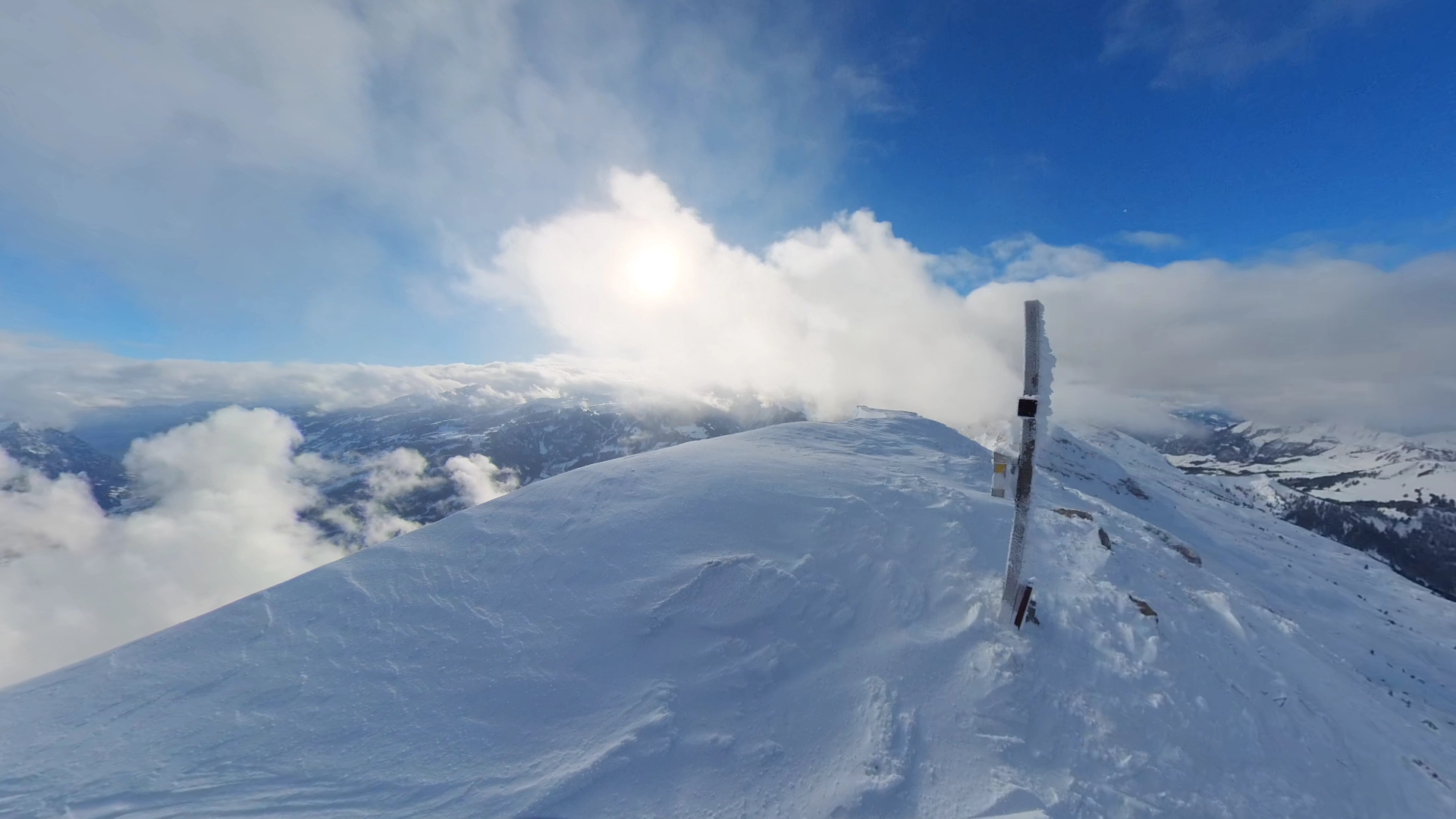 Am Anfang des Gipfelaufbaus begann die Schneeoberfläche immer eisiger zu werden. Während meine Mittourengeher alle ihre Harscheisen anlegten, konnte ich nur zuschauen – Meine Harscheisen hatte ich vergessen. Alle außer mir gehend, ich teilweise rutschend setzten wir unseren Aufstieg fort. Erleichtert, ohne Harscheisen den Gipfel erreicht zu haben fellten wir ab.