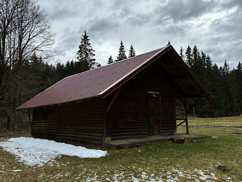 Schutzhütte am Waldrand, scheint aber auch für Feiern genutzt zu werden. In der Hütte gibt es eine Theke, außen eine große Feuerschale und oberhalb steht ein Container auf einem Fundament, evtl. eine Toilette? Die Hütte ist an allen Seiten geschlossen und dicht abgesehen vom Zugang vorne (Südosten). Betonboden ca. 4,50 x 7,50 m. Zwei breite Tische, mehrere eher schmale Bänke, verschiebbar. Zusätzlich gibt es noch eine sechseckige rundherum halbhoch geschlossene Hütte mit 5 m Durchmesser, Pflasterboden, Tischen und Bänken. Ein Stück entfernt noch eine Lager-Hütte mit defektem Dach, Bänken, Feuertonne.