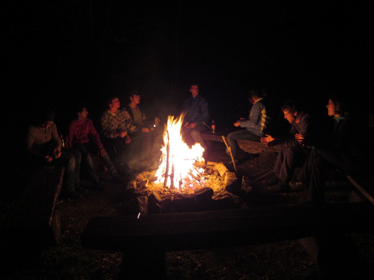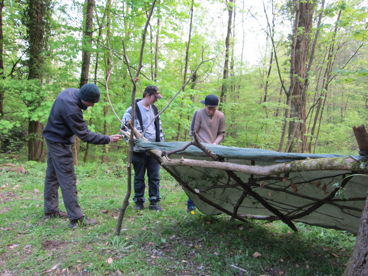 Am ersten Tag, den 15. April 2011, war es dann endlich soweit. Sechs der insgesamt acht Schüler der 9. Klasse einer Förderschule aus Baden-Württemberg starteten um 15 Uhr am Bahnhof Emmendingen in Richtung der ersten Übernachtungsmöglichkeit, der Emil-Scheer-Hütte. Nach knapp 2 Stunden erreichten wir unser erstes Tagesziel, und die Schüler machten sich daran, ihre (zum Teil selbst gestellten) Aufgaben zu erledigen. Hierzu gehörte unter anderem das Feuermachen mit einem Feuerstein, das Aufbauen des Zeltes oder auch das Suchen von Feuerholz für den Abend. Eine Gruppe entschloss sich – trotz der Aussicht auf sehr kalte Temperaturen in der Nacht – unter einem selbst gebauten Biwak zu schlafen.