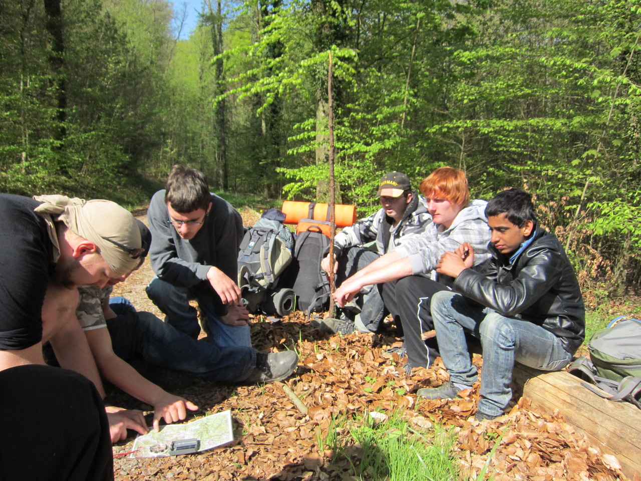 Am zweiten Tag wurden die Schüler dann in die Navigation mit Karte und Kompass eingewiesen, und es wurde ihnen gesagt, an welcher Stelle der Karte die zweite Übernachtungshütte steht. Von nun an waren sie auf sich alleine gestellt und mussten eigenverantwortlich den Weg, die Geschwindigkeit und die Pausen in der Gruppe abstimmen. Sollte sich die Gruppe für einen falschen Weg entscheiden, so würden die Betreuer nicht einschreiten, sondern ebenfalls den falschen Weg mitlaufen, wie es auch das eine oder andere Mal geschehen ist.